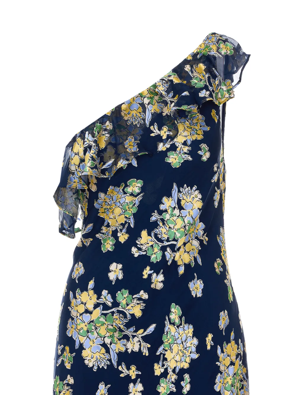 Платье миди Leon на одно плечо с рюшами и цветочным принтом Rixo, синий 65 056₽