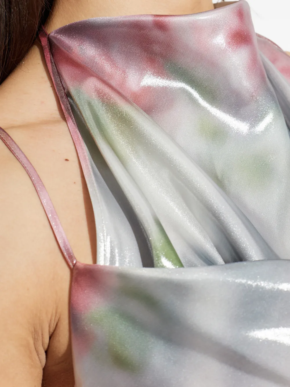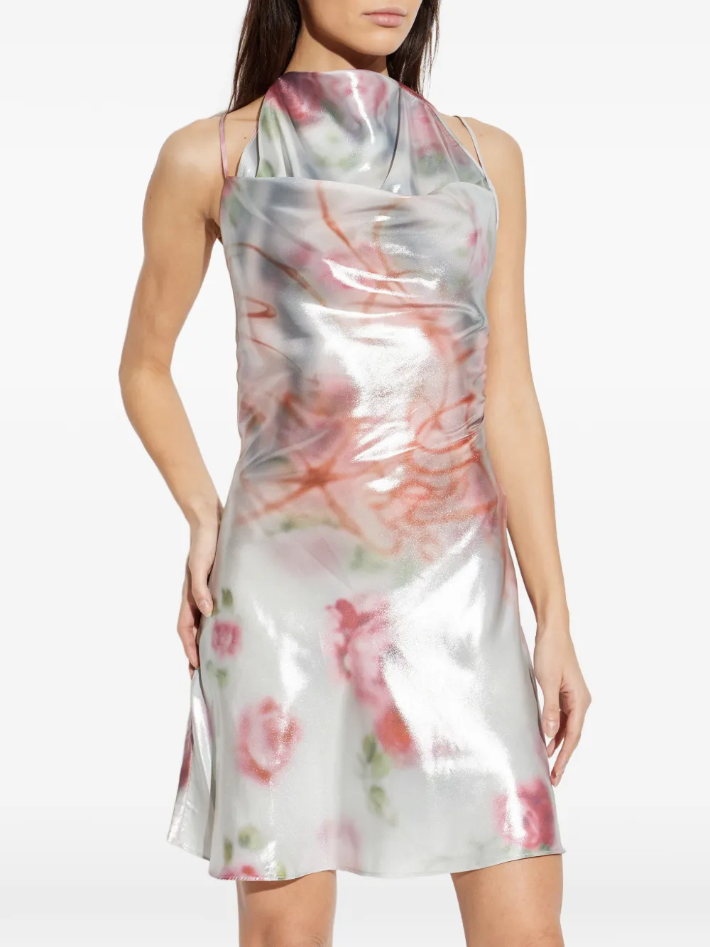 Белое платье с цветочным принтом, хальтер с драпировкой на декольте, тонкие бретельки, открытая спина