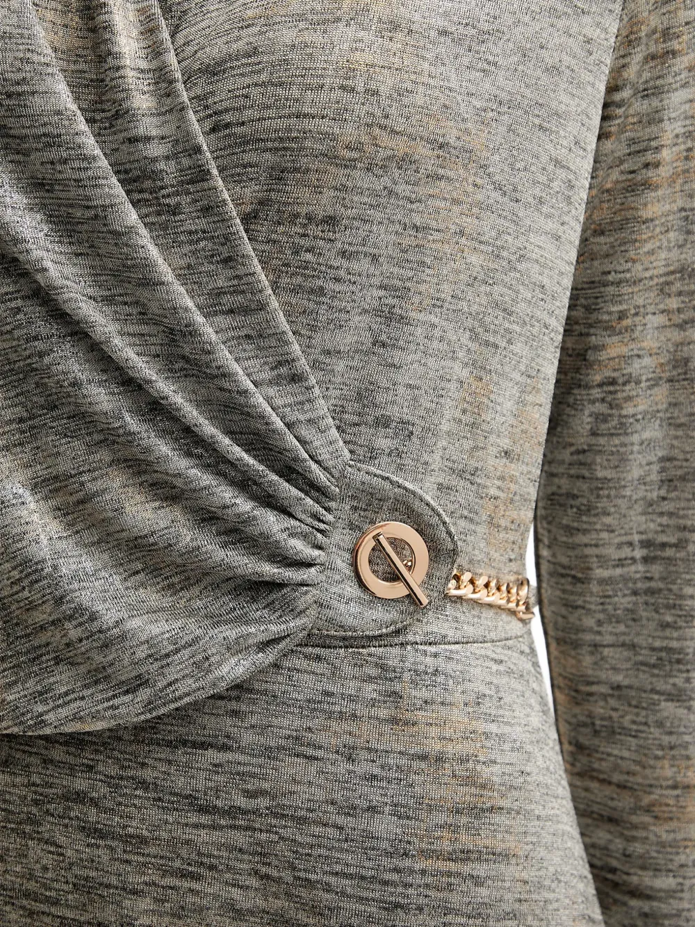 Серый металлик с отделкой, драпированная деталь, V-образный вырез, отделка цепочкой, длинные рукава