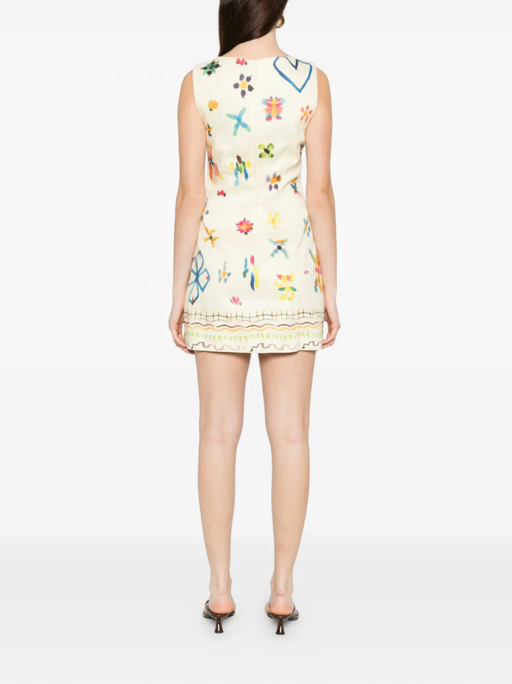Светло-желтое мини-платье без рукавов с принтом в виде рисунков
