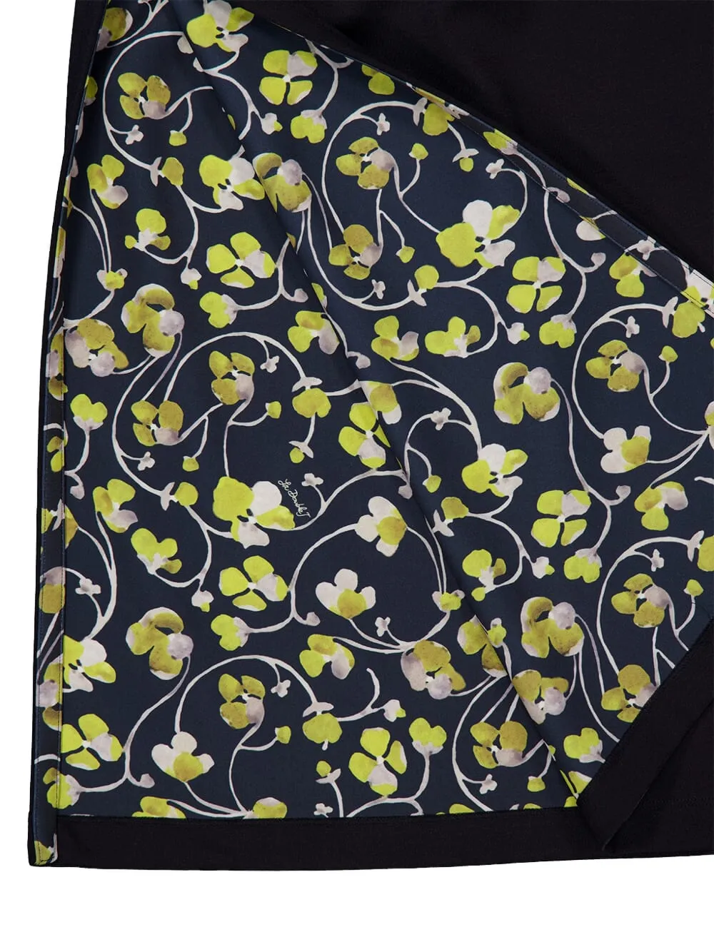 Черное платье миди с цветочным принтом на подкладе, круглым вырезом и короткими рукавами