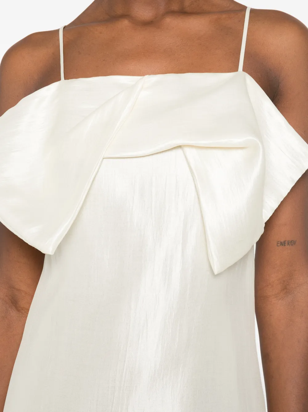 Молочно-белый, с оборками, без рукавов, на тонких бретельках, без застежки, прямой низ