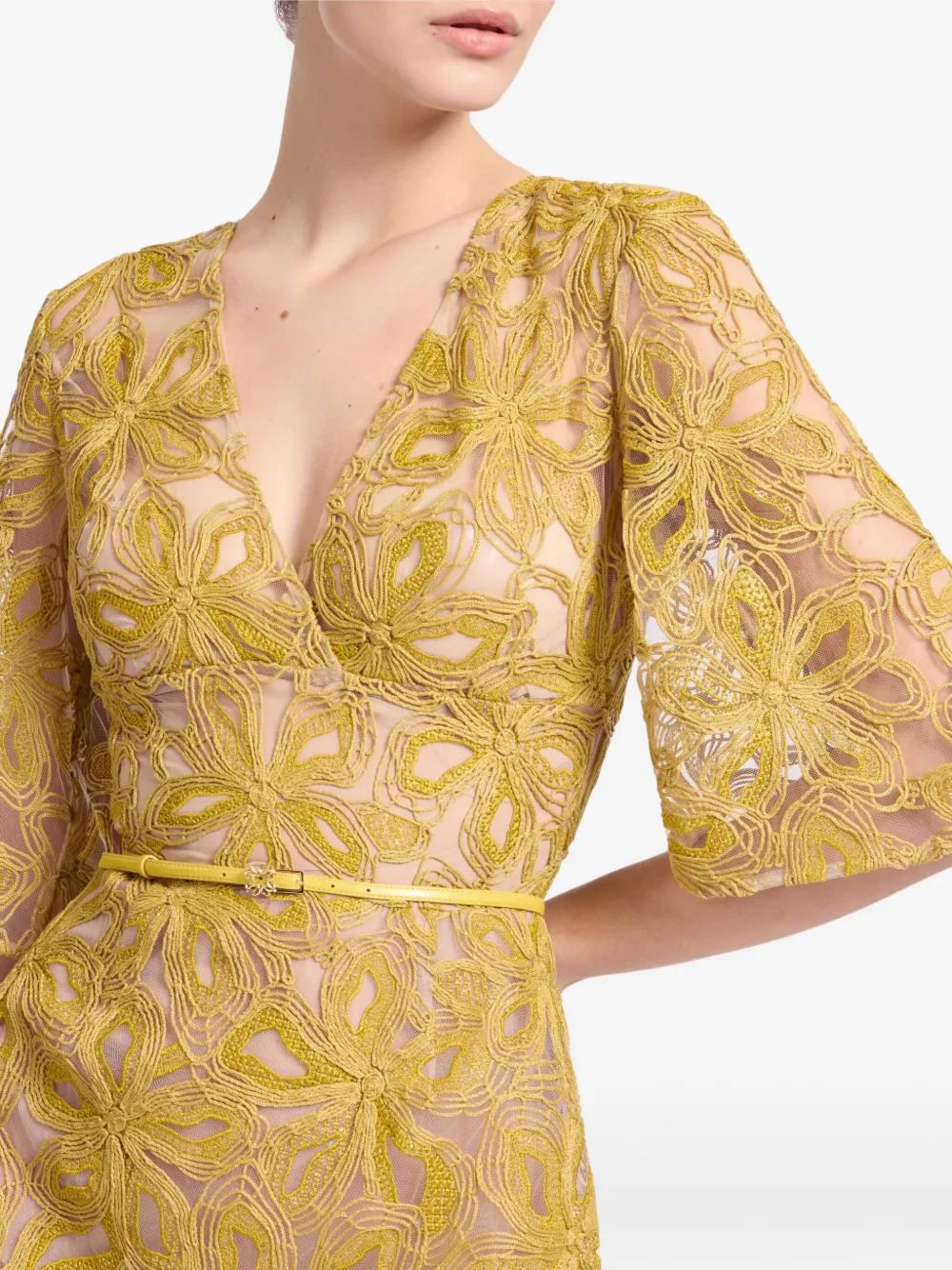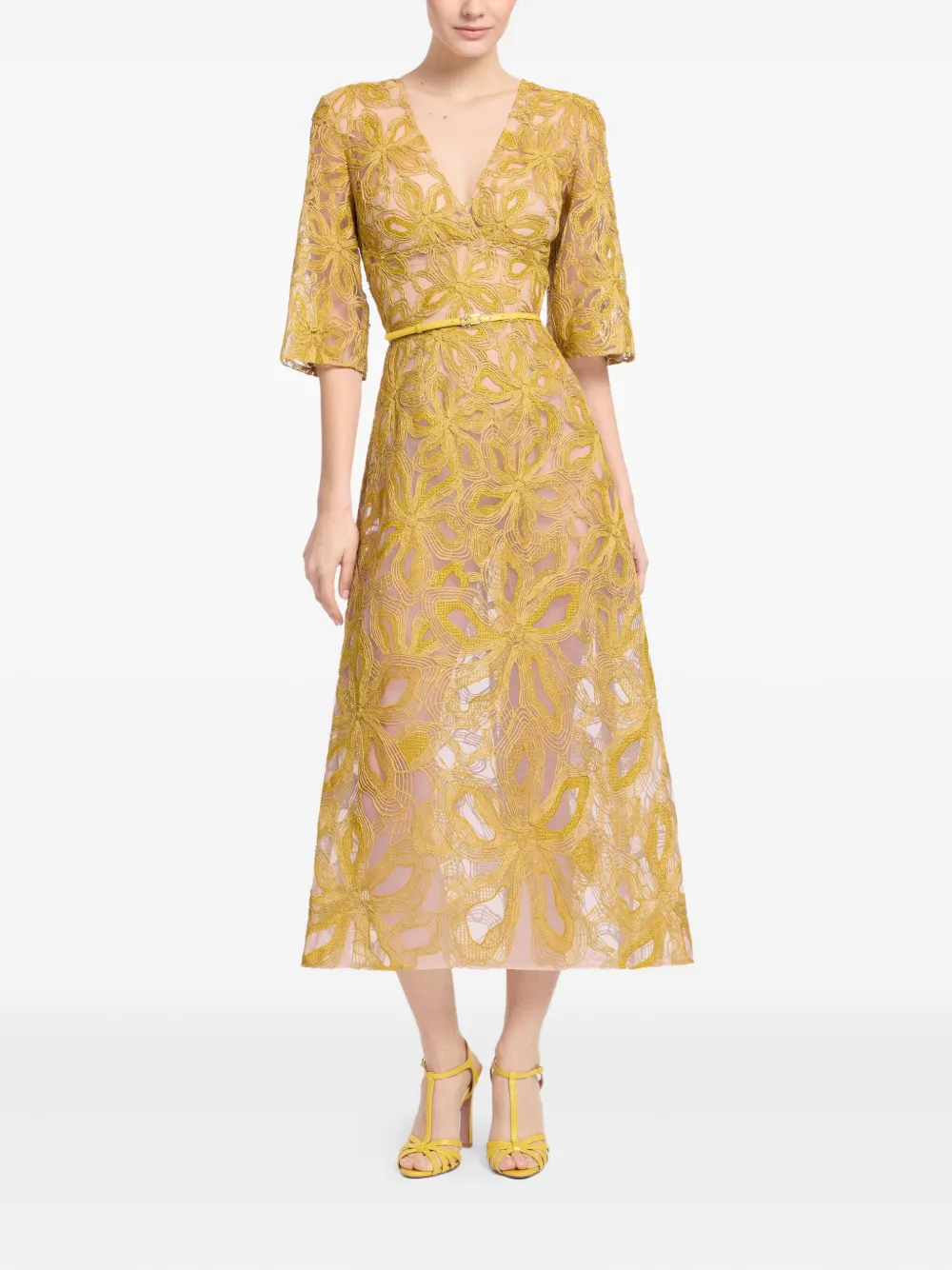 Желтое платье миди с цветочной вышивкой, V-образным вырезом, поясом и рукавами три четверти