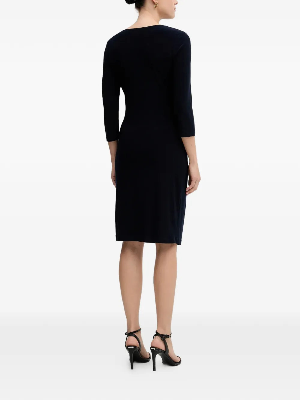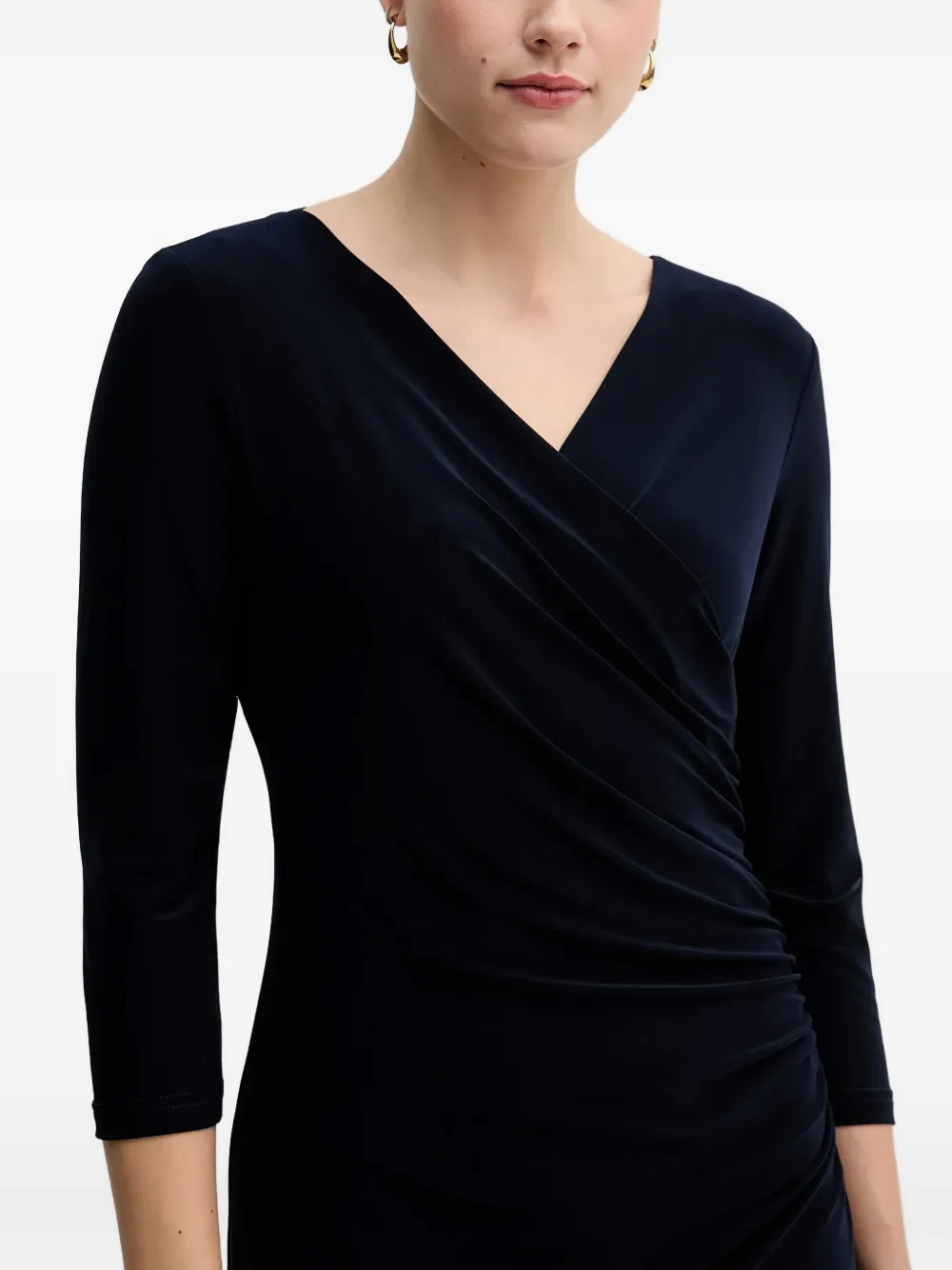 Темно-синее платье с V-образным вырезом, рукавами три четверти, драпировкой и запахом