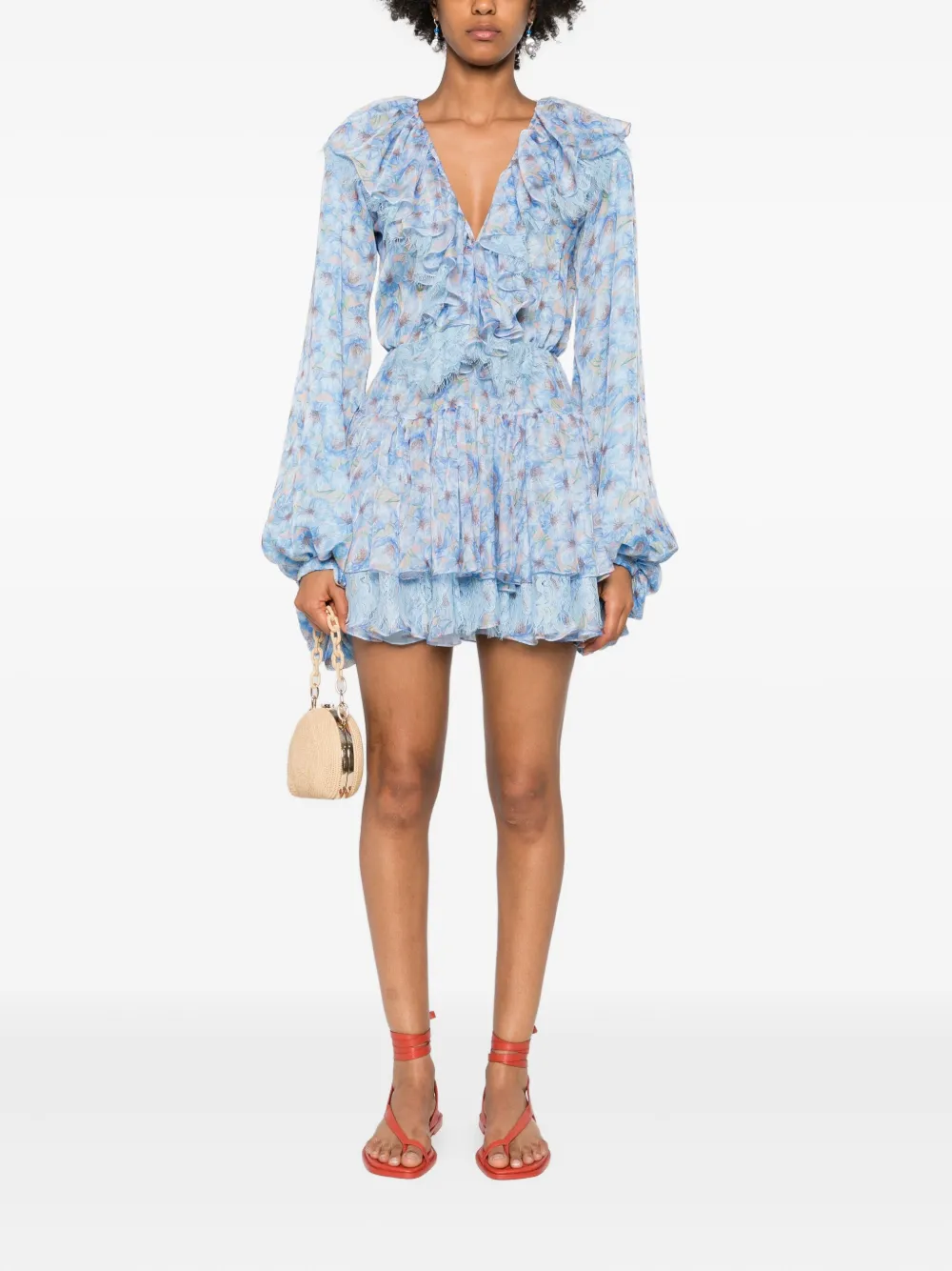 Голубой цветочный принт оборчатый низ V-образный вырез длинные рукава