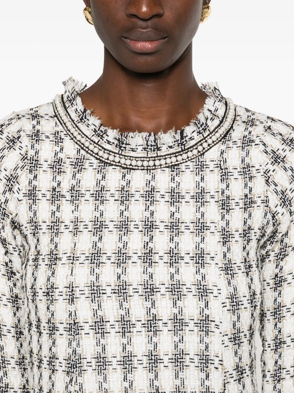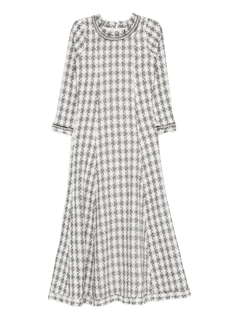 Бело-черный клетчатый дизайн, украшенный вырез и манжеты, рукава 3/4, расклешенный подол