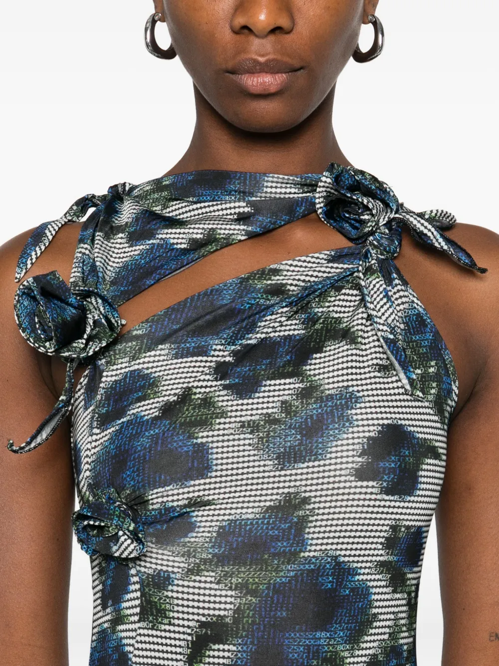 Синее платье с цветочным принтом, драпированным вырезом, асимметричным подолом, разрезом сбоку и украшением в виде роз