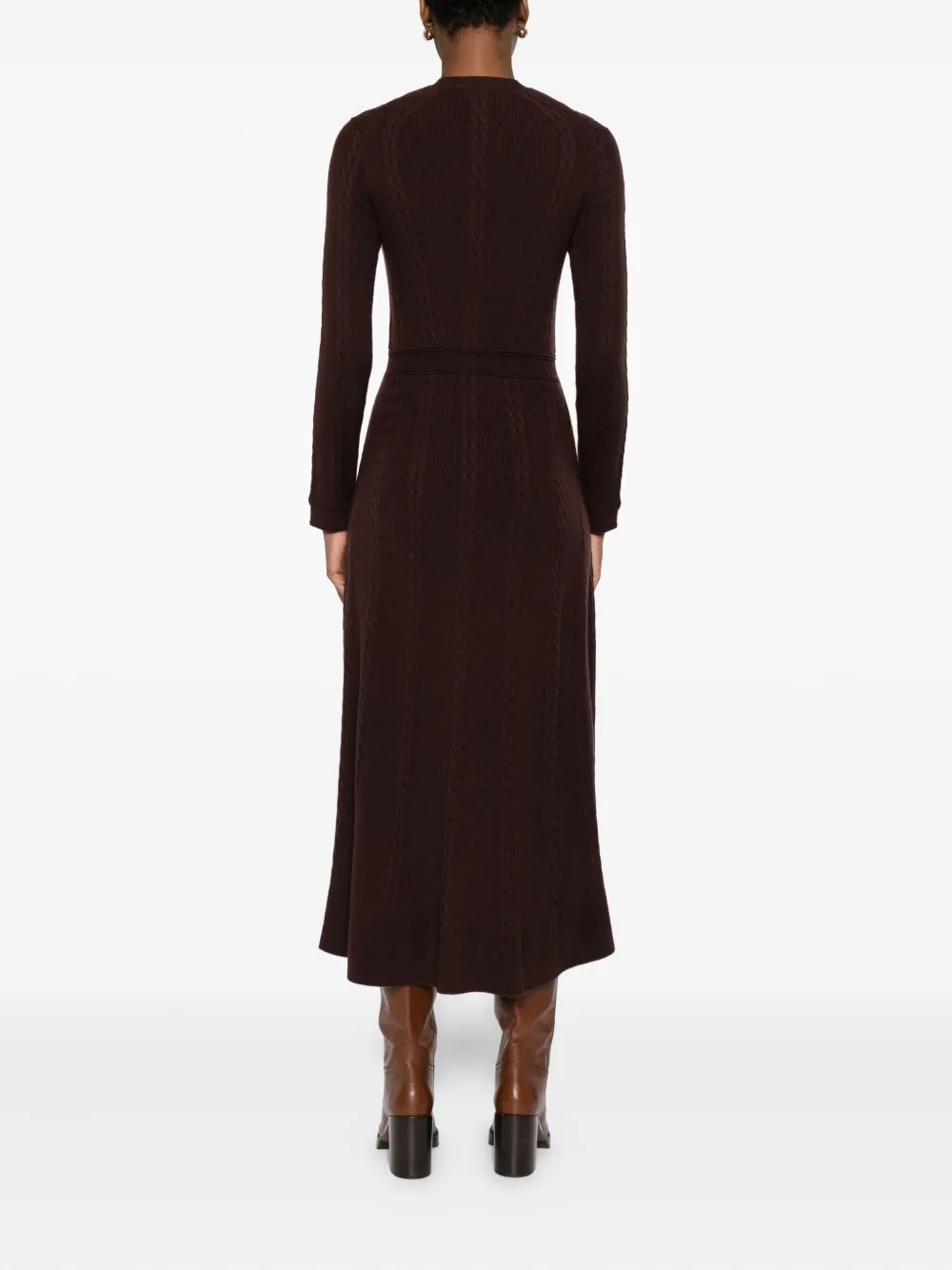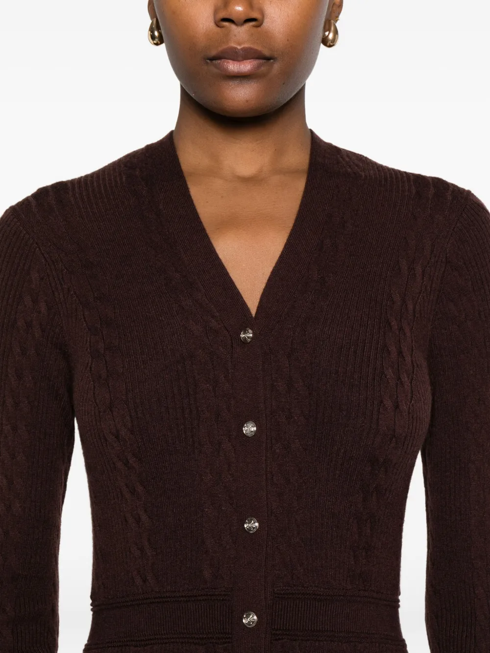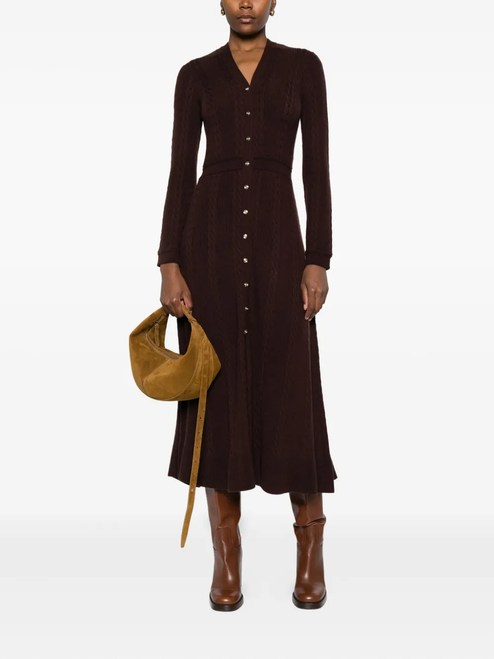 Коричневый косичка (вязаный узор) застежка на пуговицах V-образный вырез длинные рукава юбка А-силуэта