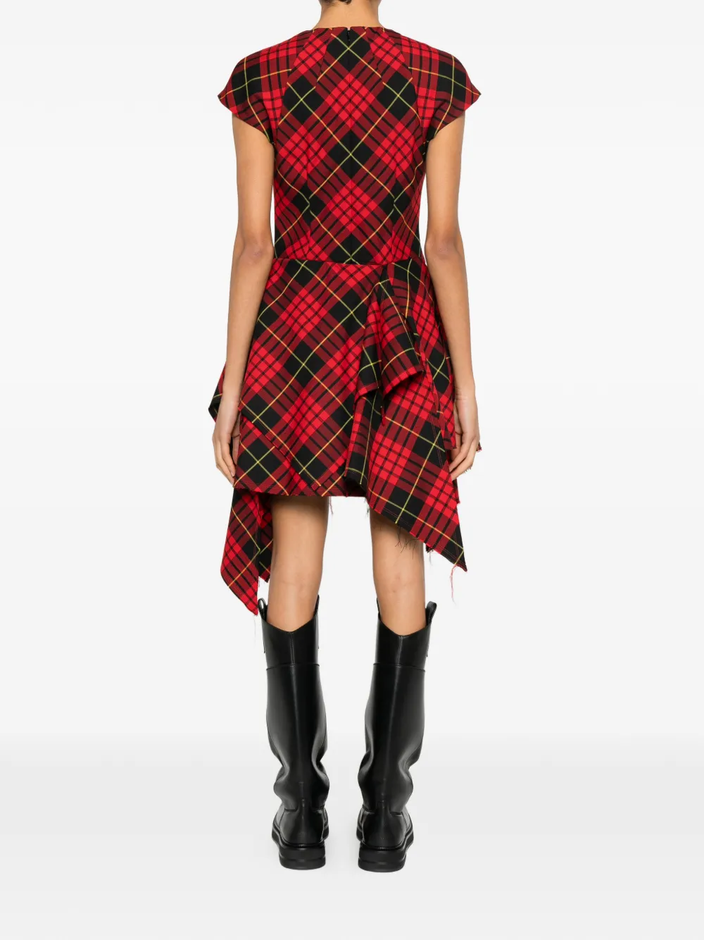 Красный в клетку, драпировка, круглый вырез, короткие рукава, необработанный край