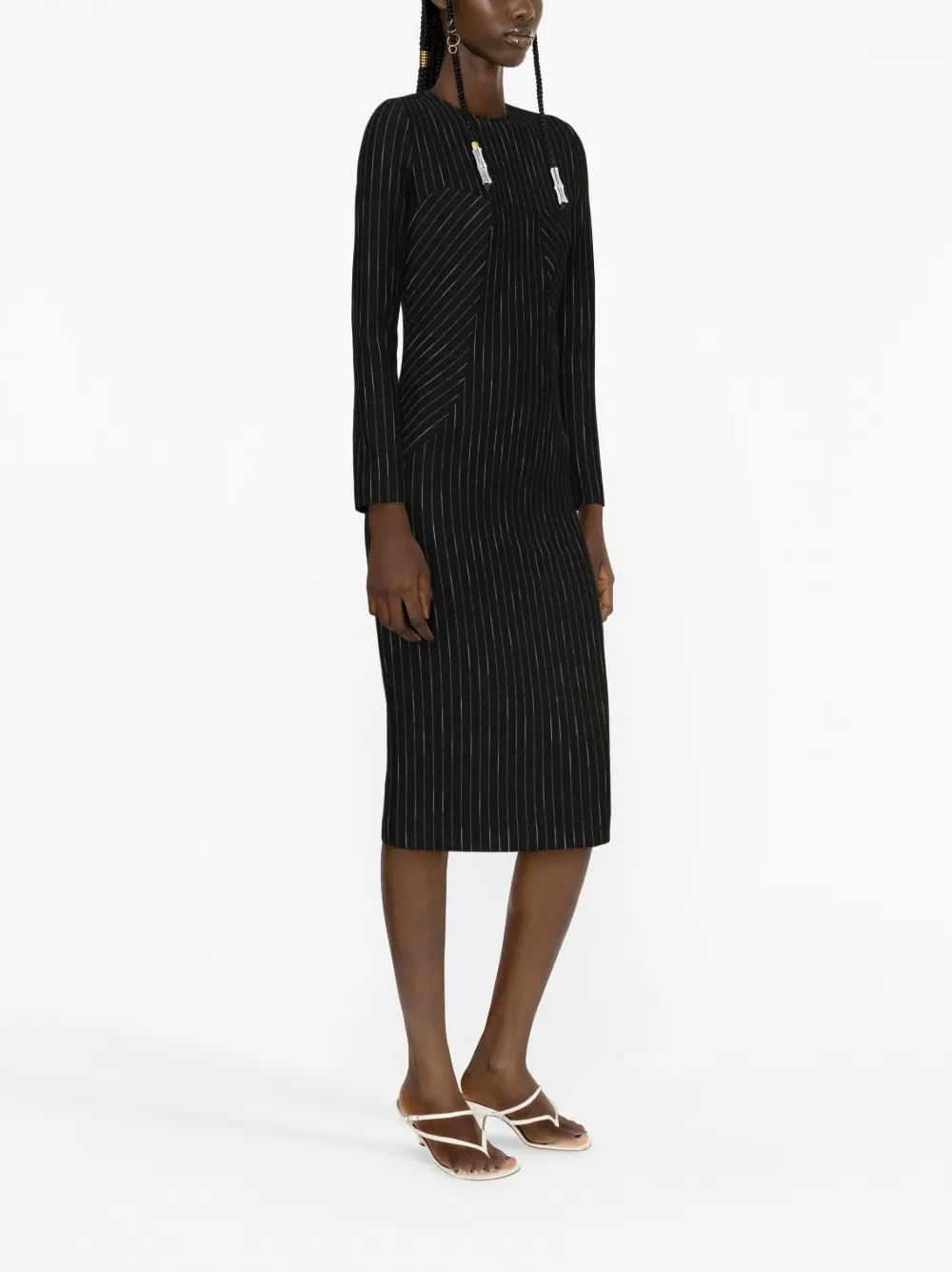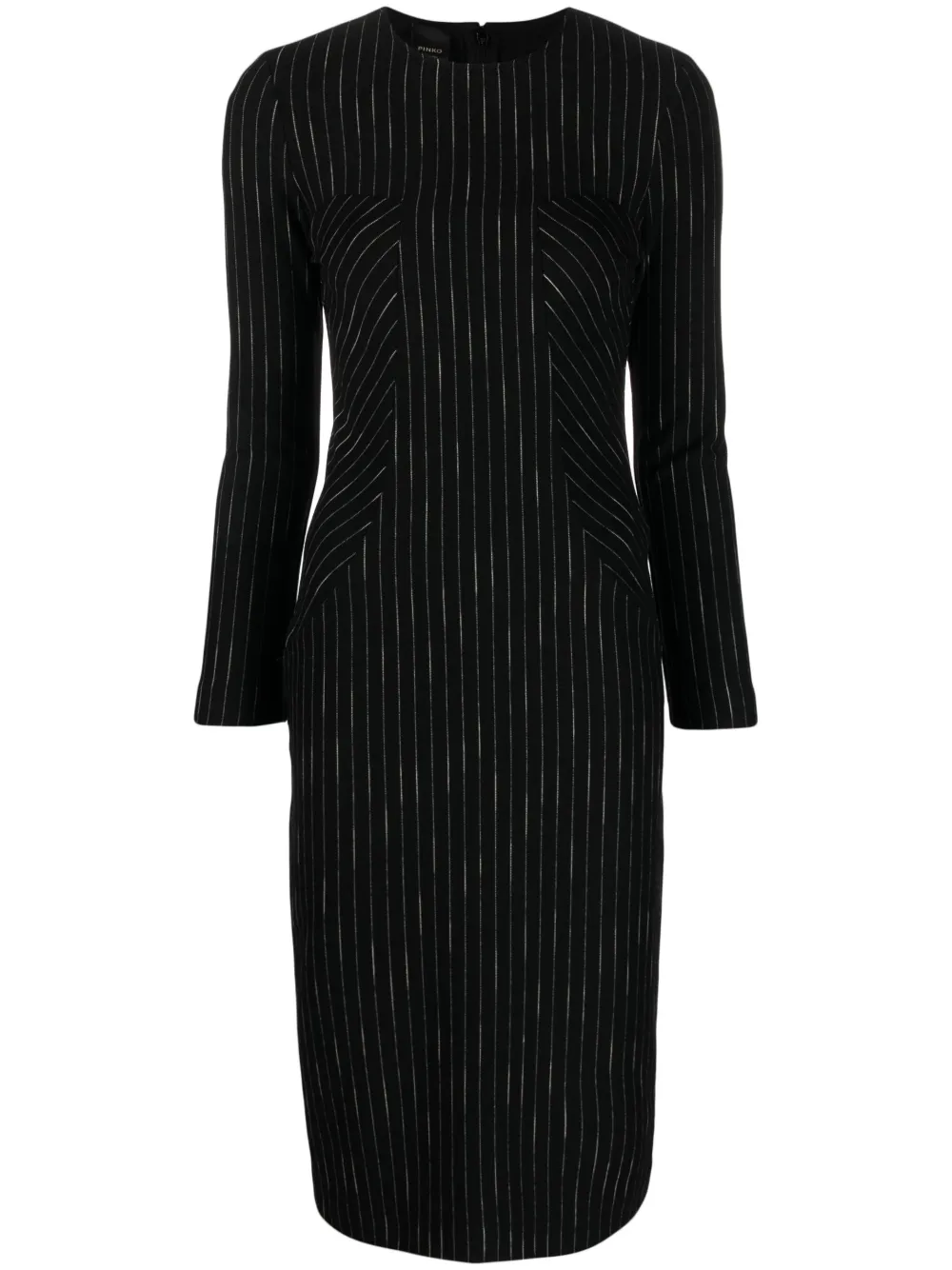 Черный, эластичный материал, полоски, круглый вырез, длинные рукава, длина по колено и прямой подол.