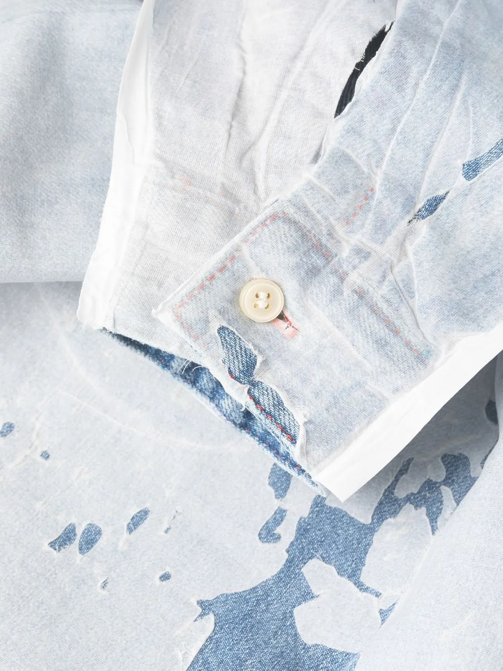 Голубой, индиго, хлопок, модель из обработанного денима, эффект потертости, вышитый логотип, классический воротник, застежка на пуговицах спереди, длинные рукава, манжеты на пуговицах, закругленный подол и длина миди.