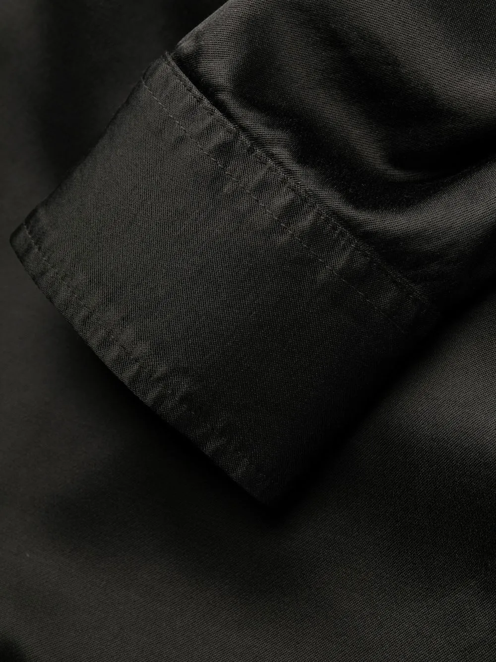 Черный, классический воротник, застежка на пуговицах спереди, длинные рукава и закругленный подол.