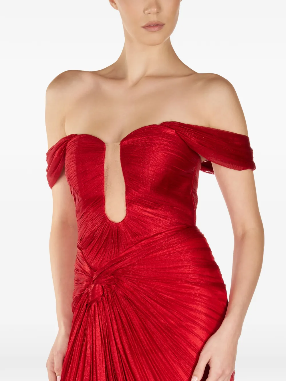 Красное платье с открытыми плечами, узлом, разрезом, сборками и шнуровкой