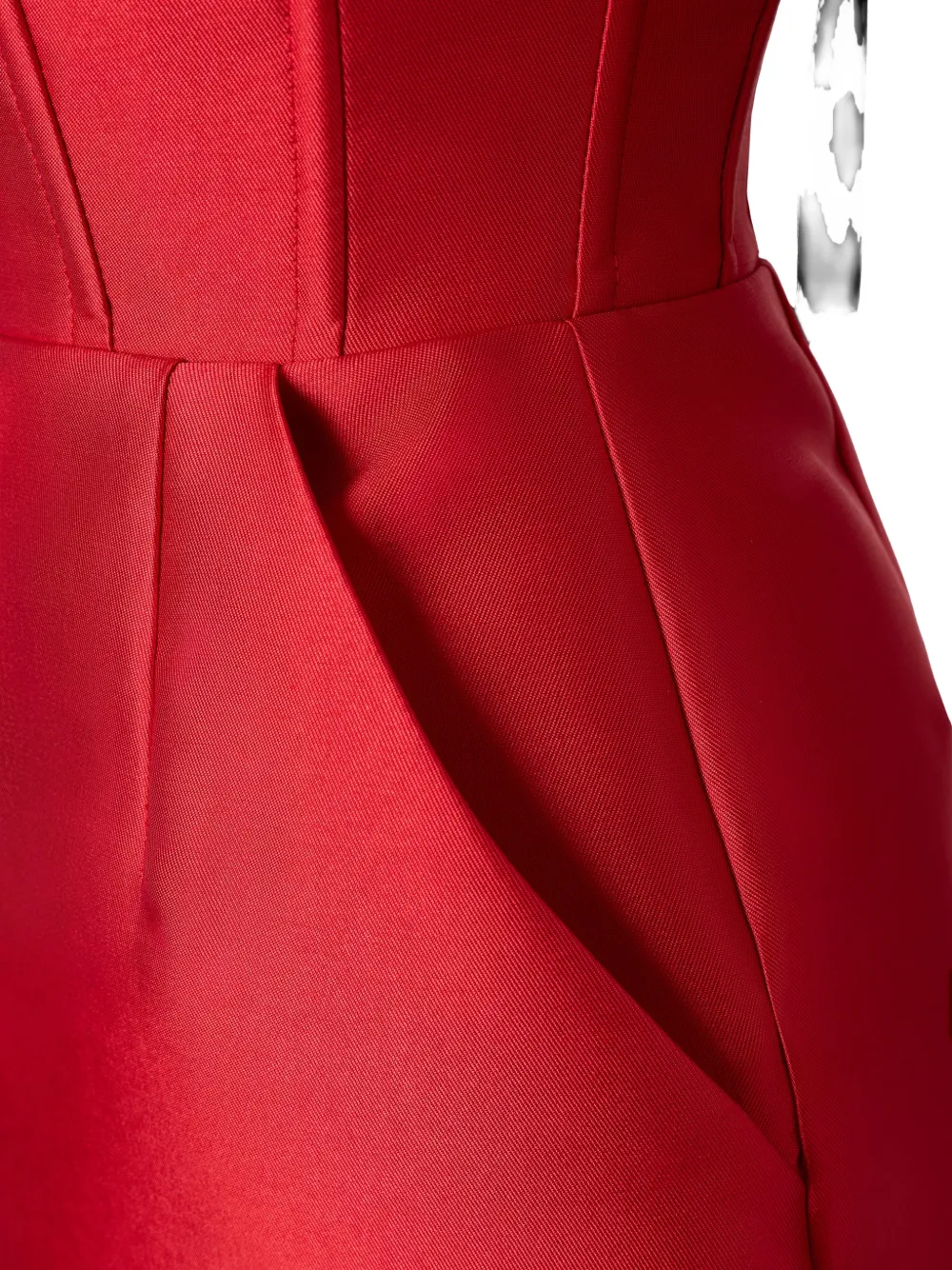 Красный цвет, фасон с открытыми плечами, задний бант, разрез сзади, конструкция с панелями, боковые карманы