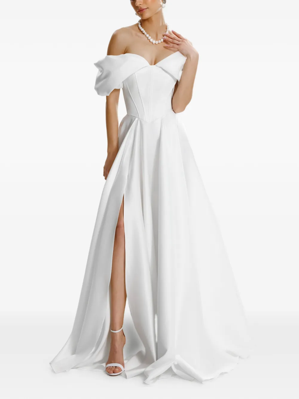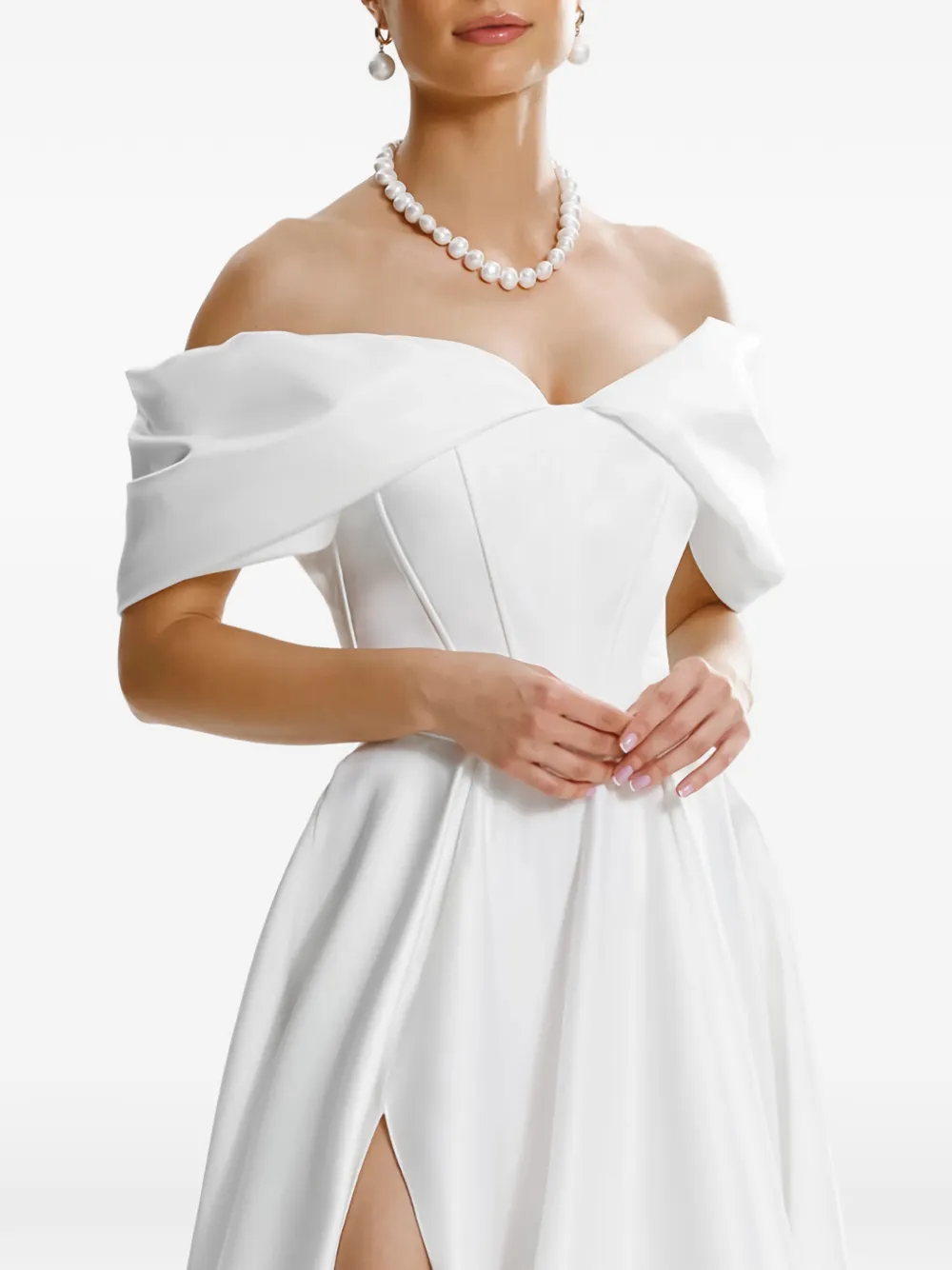 Белый корсет с открытыми плечами, шнуровкой на спинке и разрезом на ноге