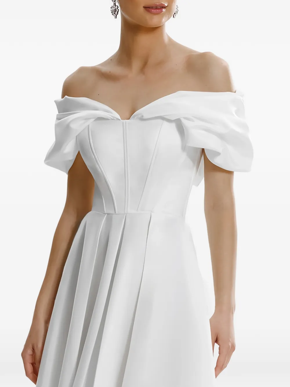 Белое платье с открытыми плечами, корсетными деталями, короткими рукавами, юбкой А-силуэта и шнуровкой