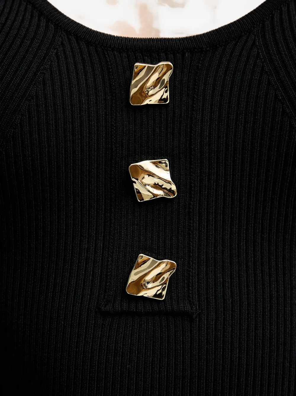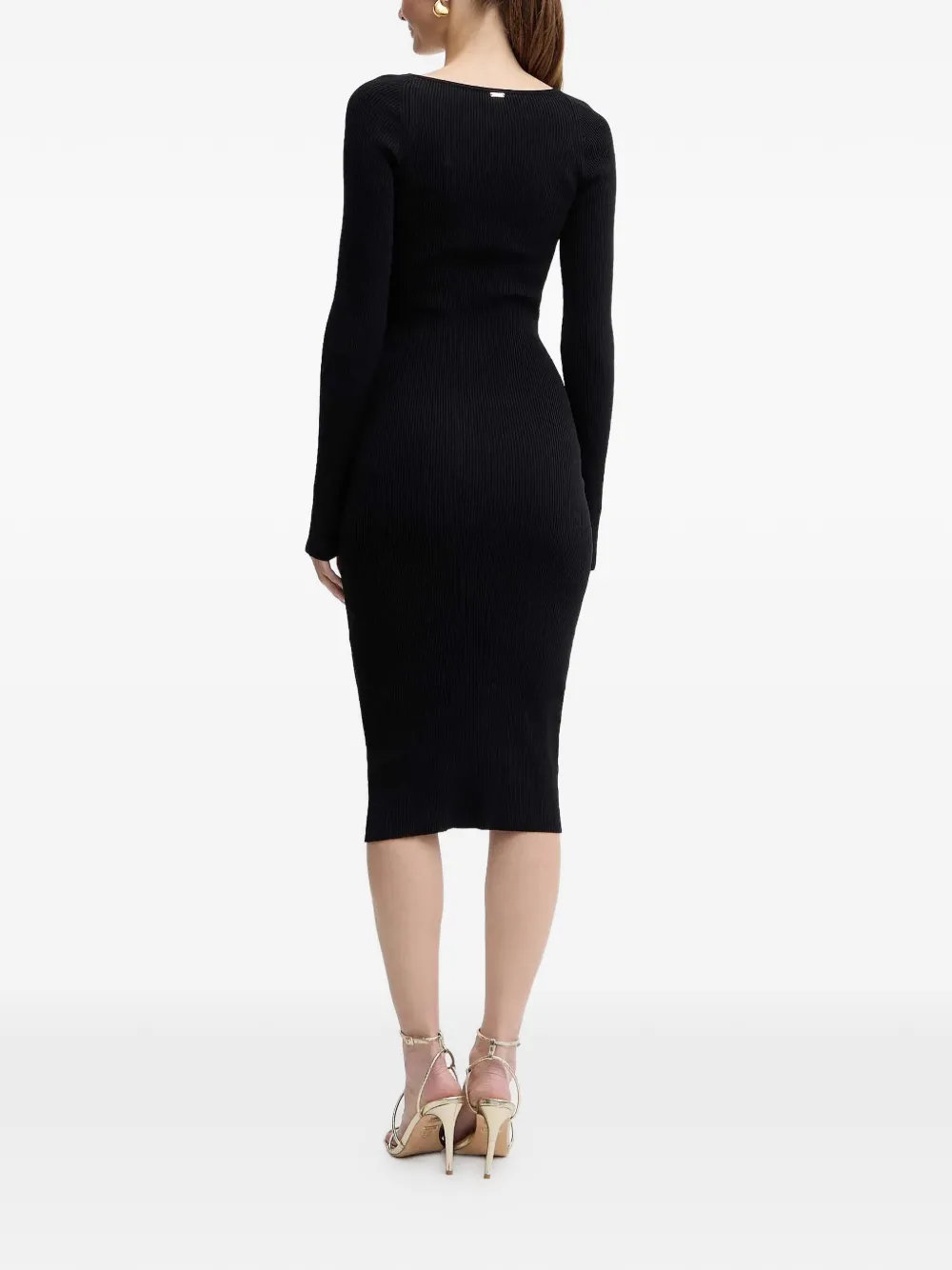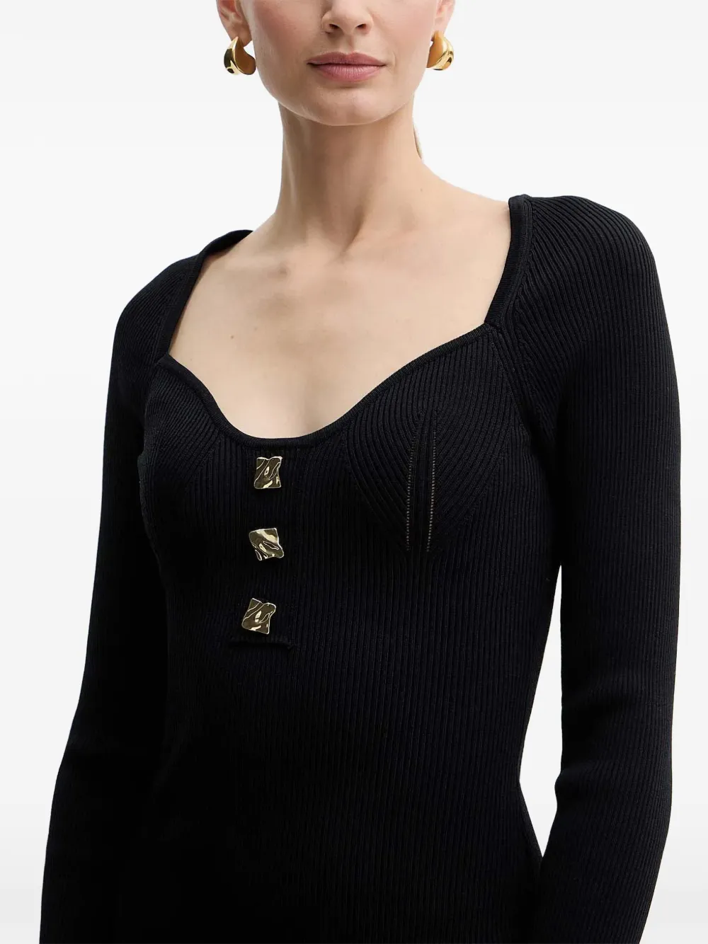 Черное вязаное платье в рубчик длины миди с квадратным вырезом и декоративными пуговицами