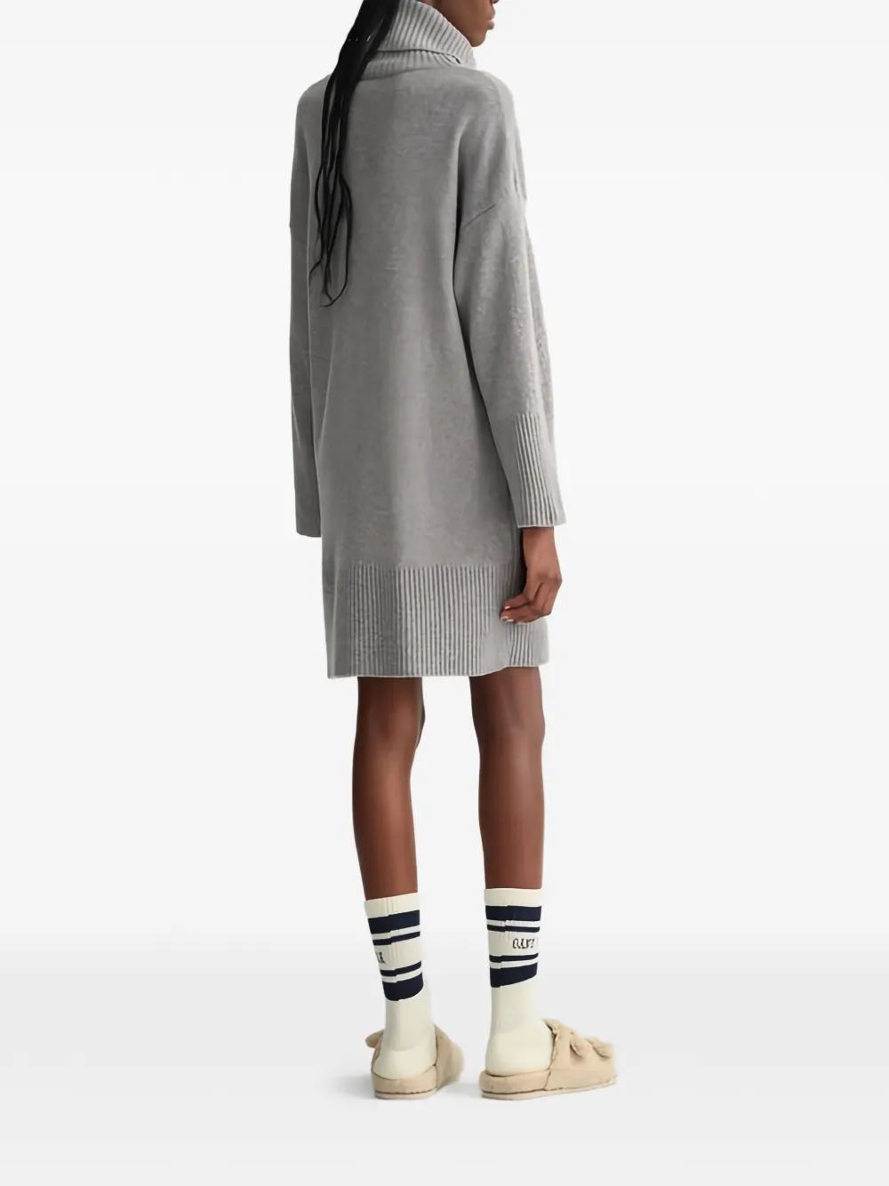 Серый свитер с воротником-стойкой, ребристым подолом, длинными рукавами с ребристыми манжетами, длина до колена