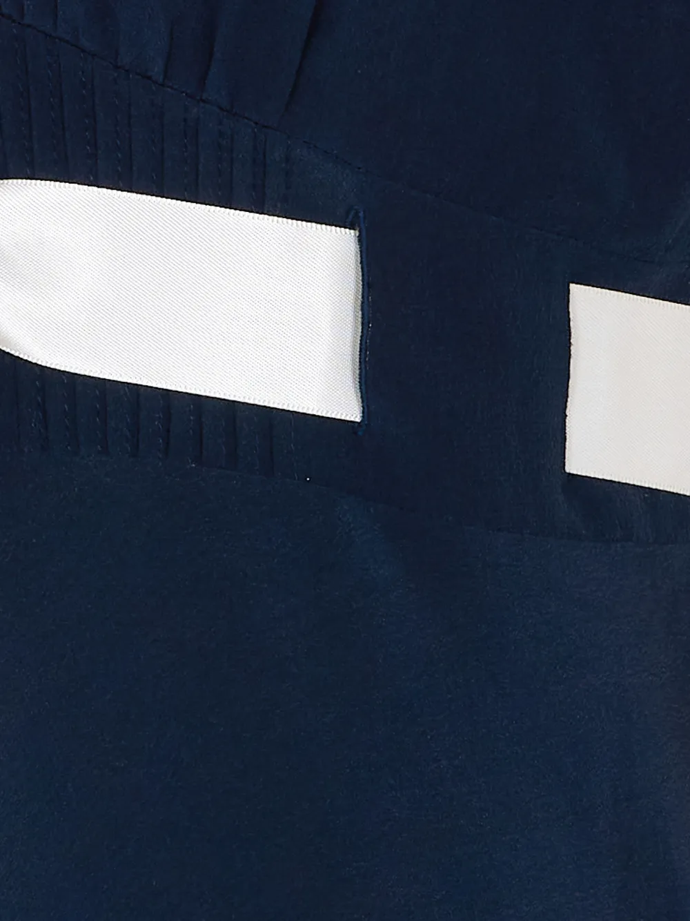 Синее платье с кружевной отделкой, V-образным вырезом и короткими рукавами