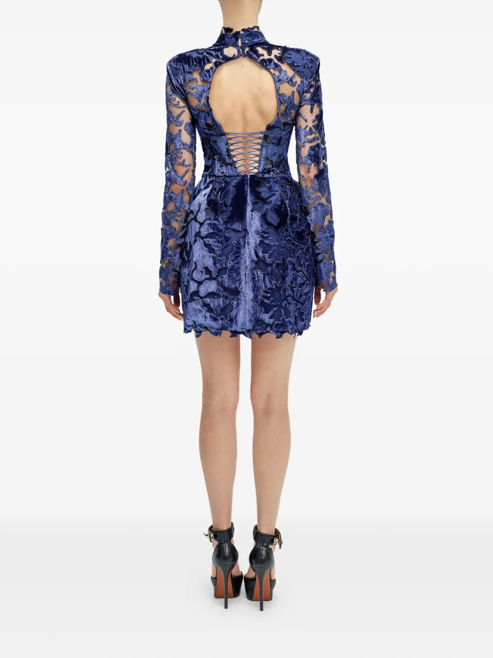 Синие детали из кружева, длинные рукава, вырезы, воротник-стойка, шнуровка на спине