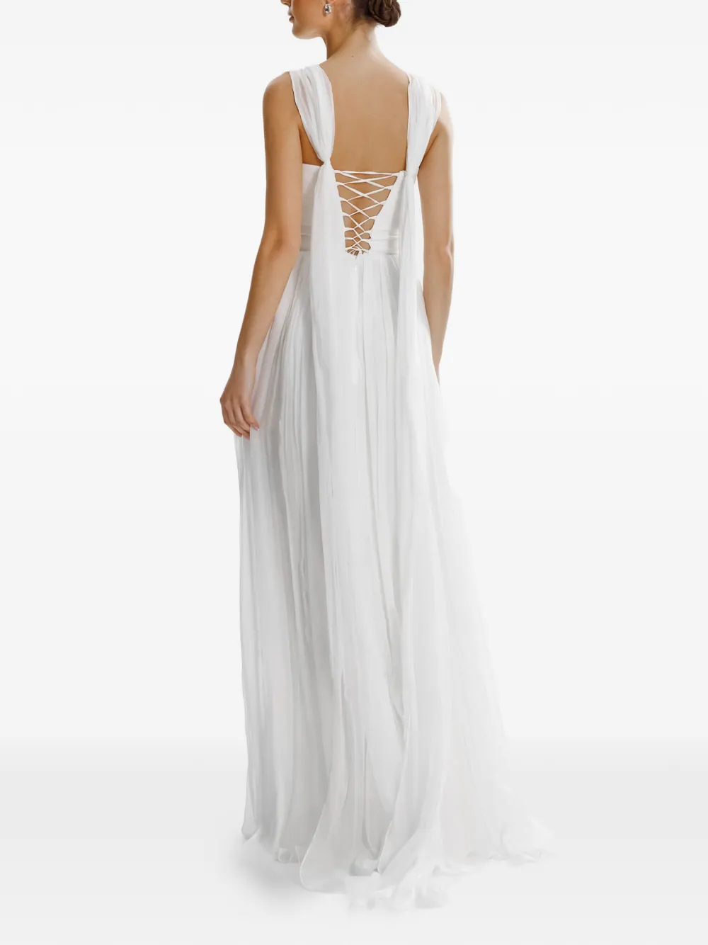 Белое плиссированное платье с бретелями, шнуровкой на спине, приталенным силуэтом и длиной в пол