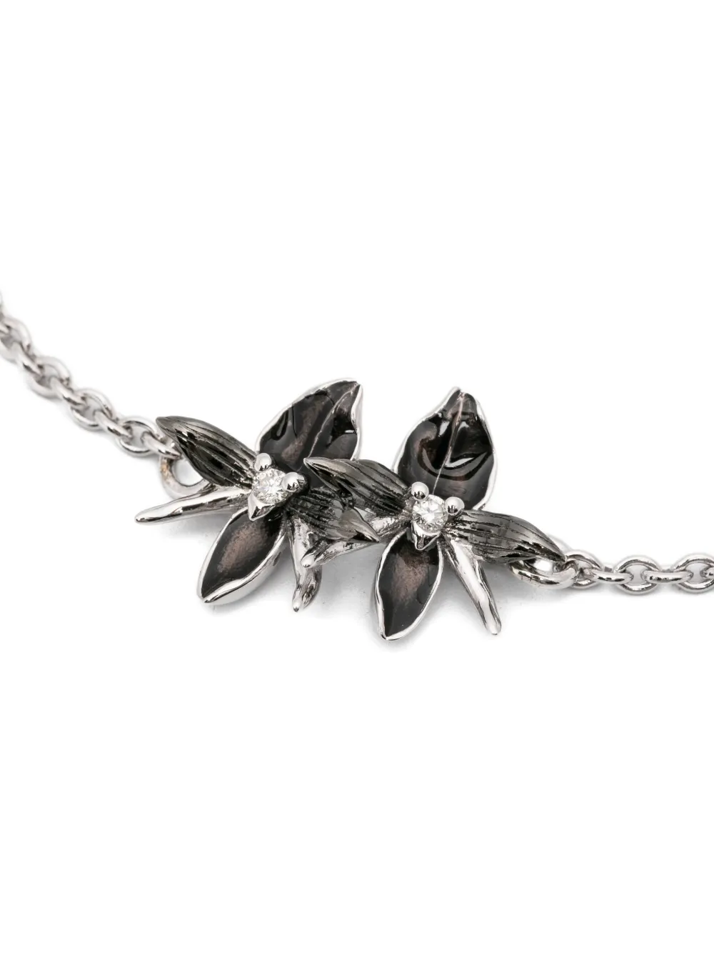 Стерлинговое серебро, белые бриллианты, украшения в виде орхидей, застежка-карабин, регулируемая длина, тонкая цепочка. При обычном ежедневном использовании и воздействии внешних факторов блеск драгоценных камней и золотых поверхностей может уменьшаться. Для ухода используйте специальные неабразивные средства, предназначенные для чистки ювелирных изделий.