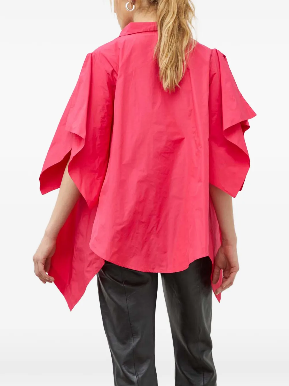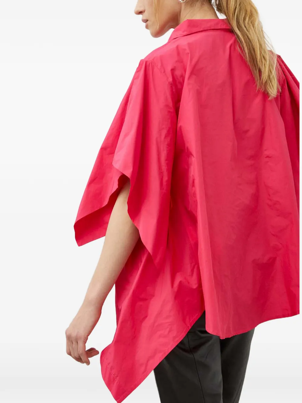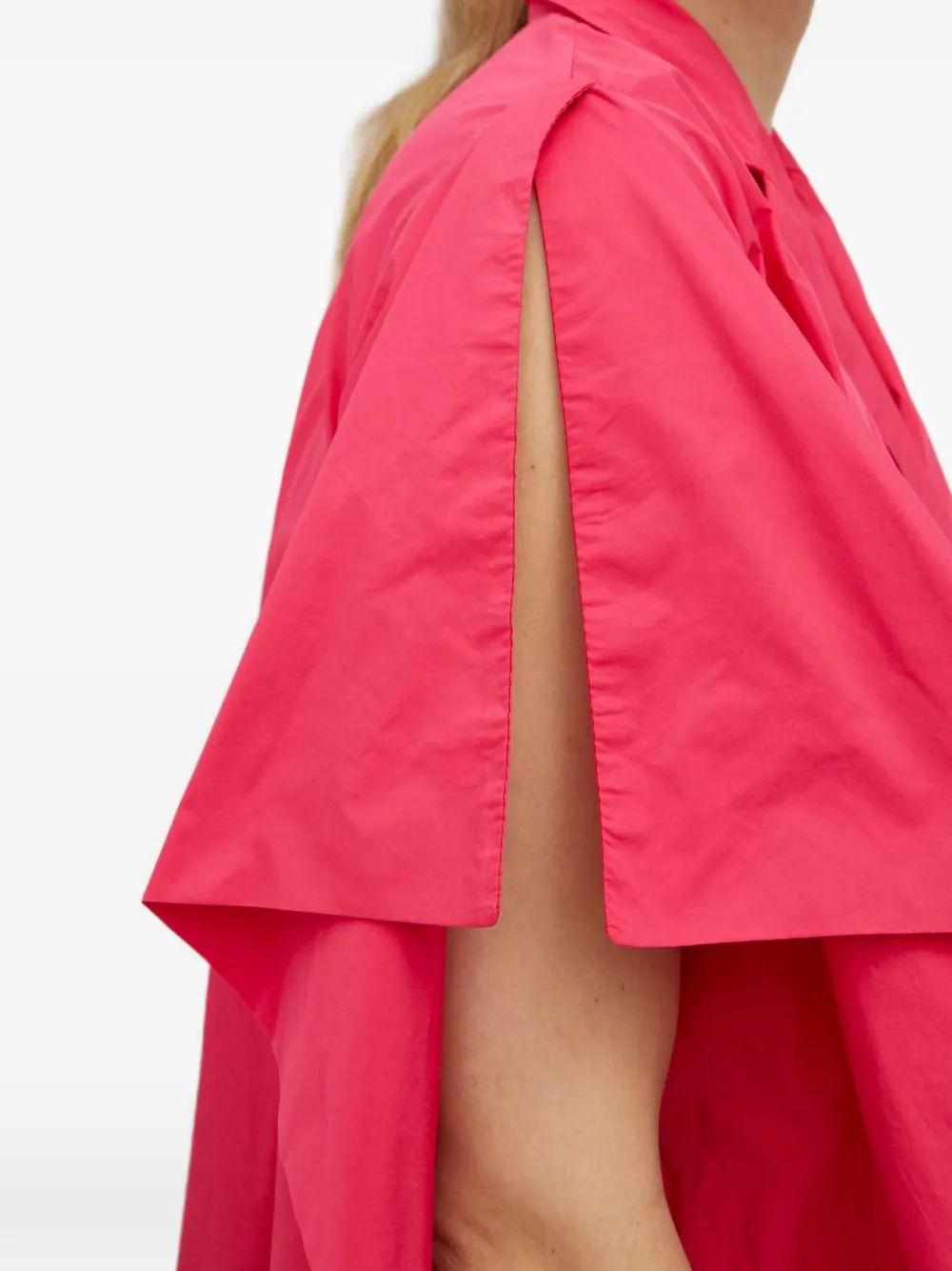 Малиново-розовый, свободный крой, V-образный вырез, асимметричный подол, разрезы на рукавах