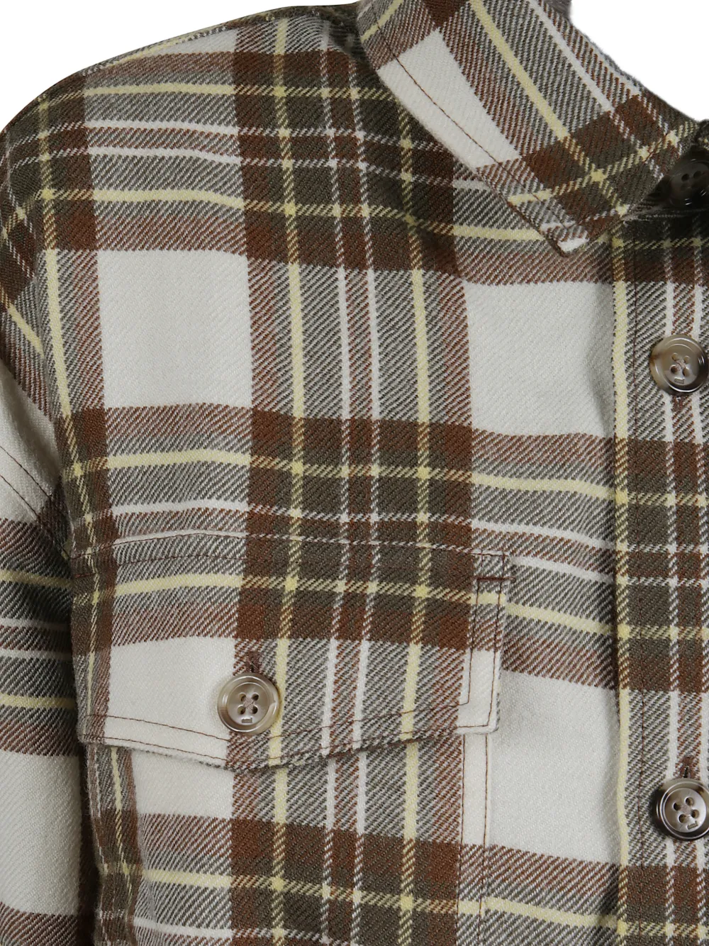 Бежево-коричневая рубашка в клетку, воротник с острыми концами, застежка на пуговицы, нагрудные карманы, длинные рукава