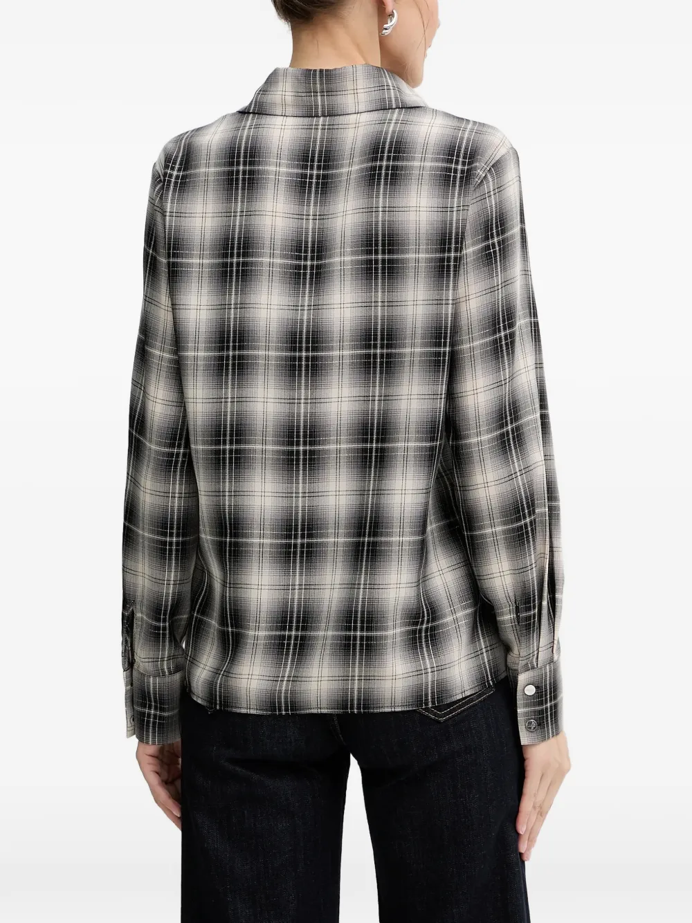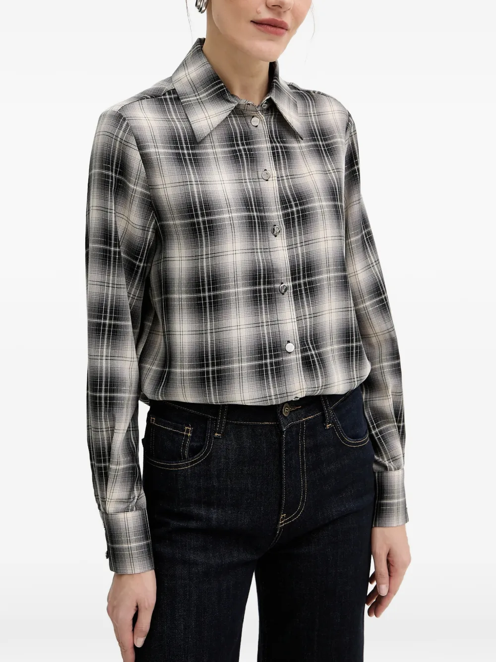 Черно-бежевый в клетку, застежка на пуговицы, длинные рукава, манжеты на пуговицах