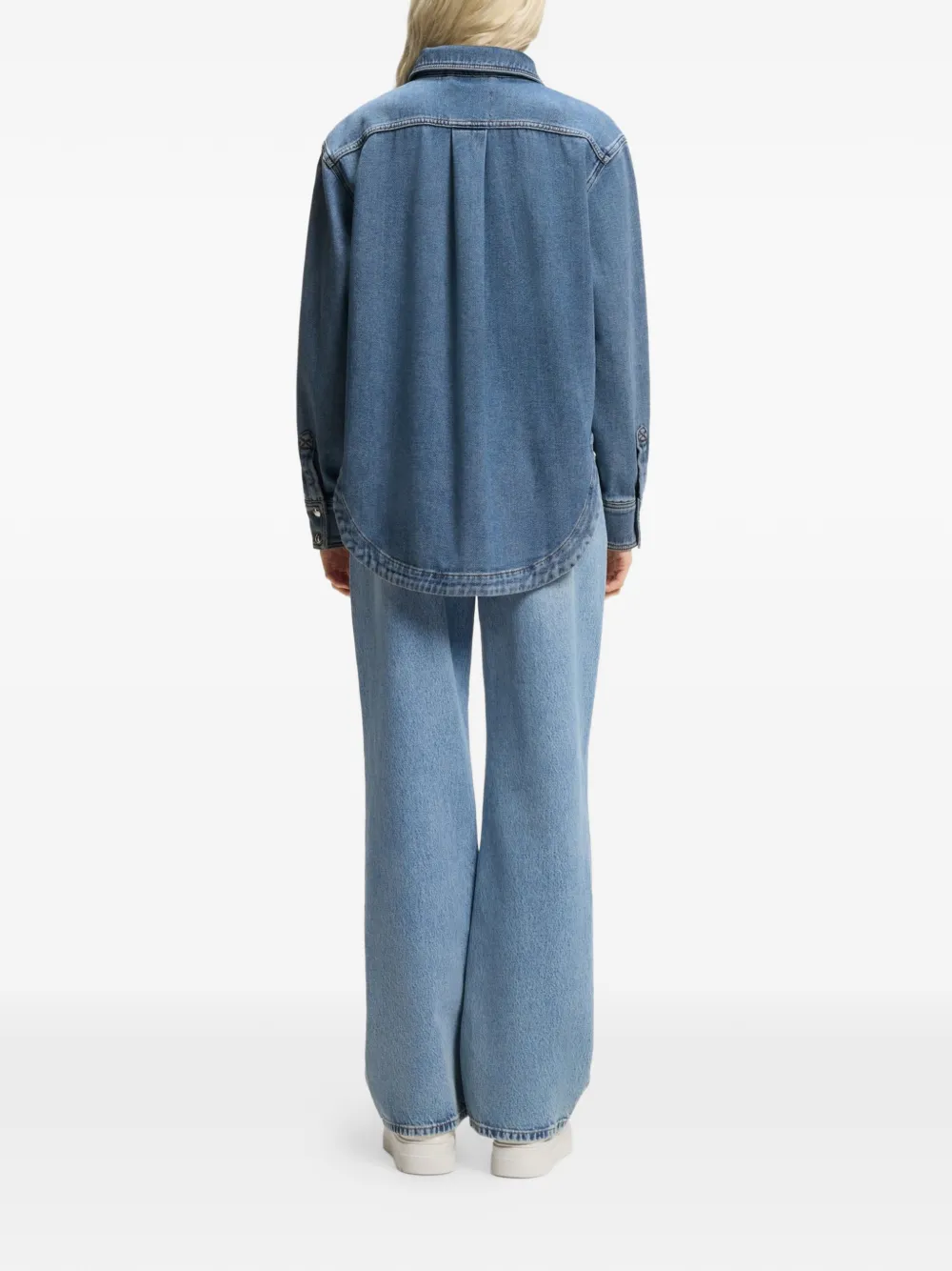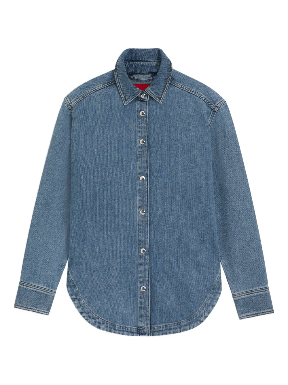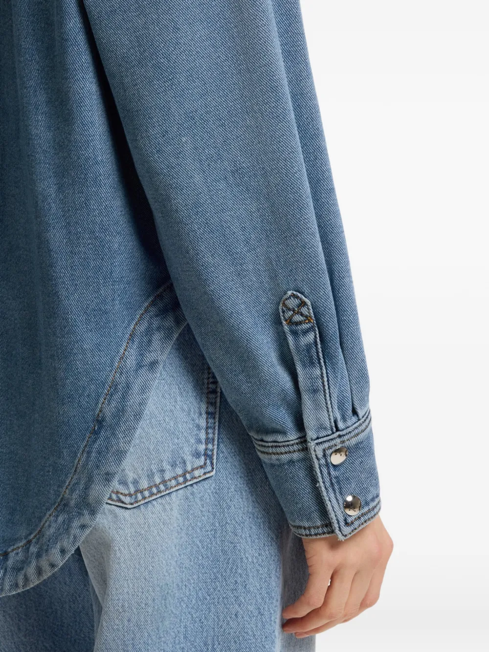 Голубой цвет, тональная строчка, застежка на пуговицы, длинные рукава, изогнутый подол, манжеты на пуговицах