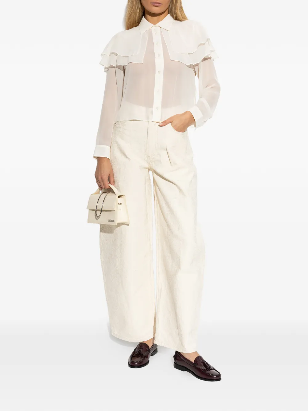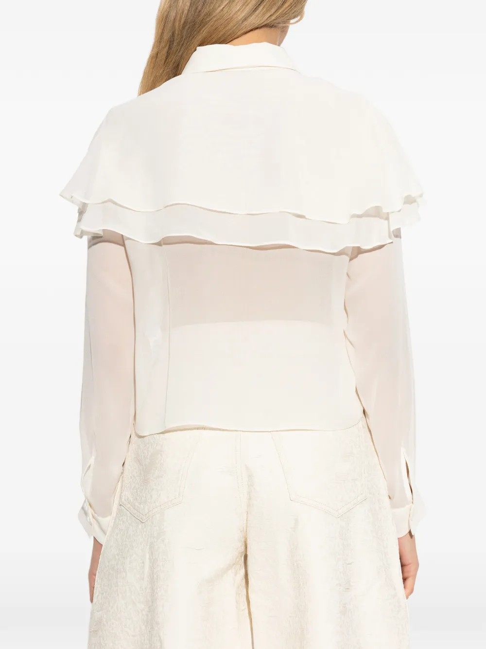 Молочно-белая блузка с оборчатым воротником, застежкой на пуговицы и длинными рукавами