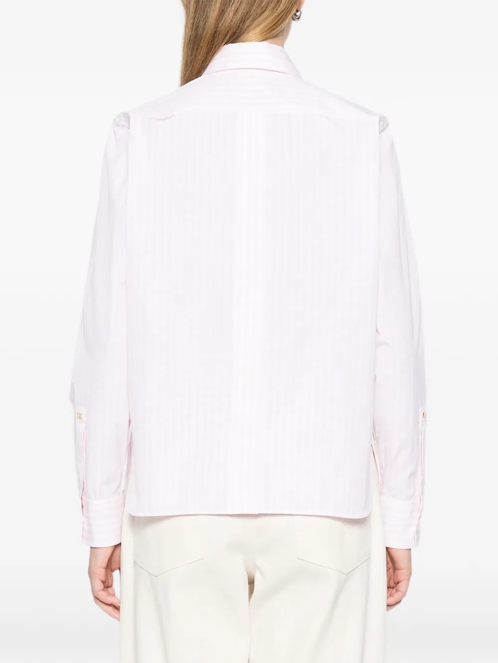 Бледно-розовые вертикальные полосы, длинные рукава, застежка на пуговицы, манжеты на пуговицах