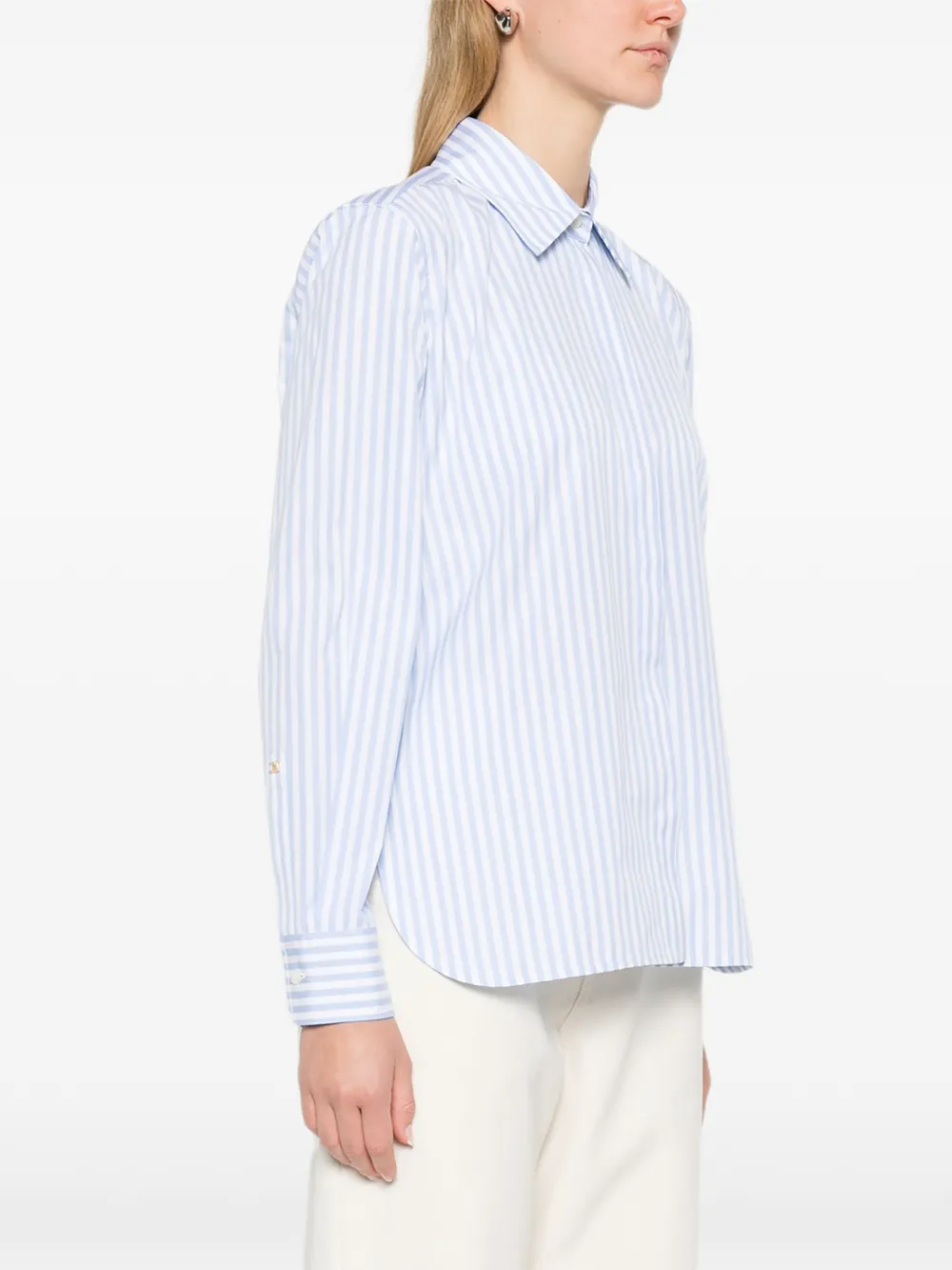 Светло-голубой с полосатым узором, длинные рукава, застежка на пуговицы, манжеты на пуговицах