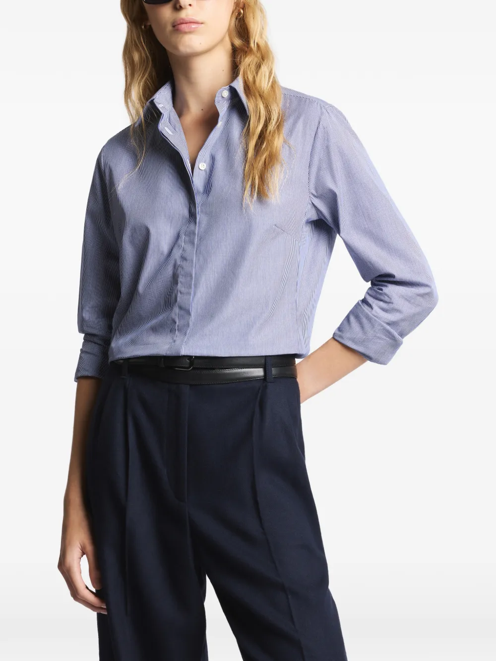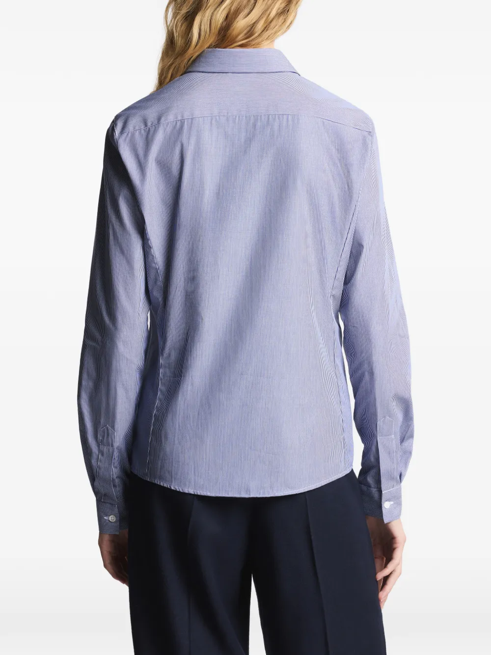 Синяя рубашка в полоску с застежкой на пуговицы, длинные рукава, манжеты на пуговицах, вышитый логотип