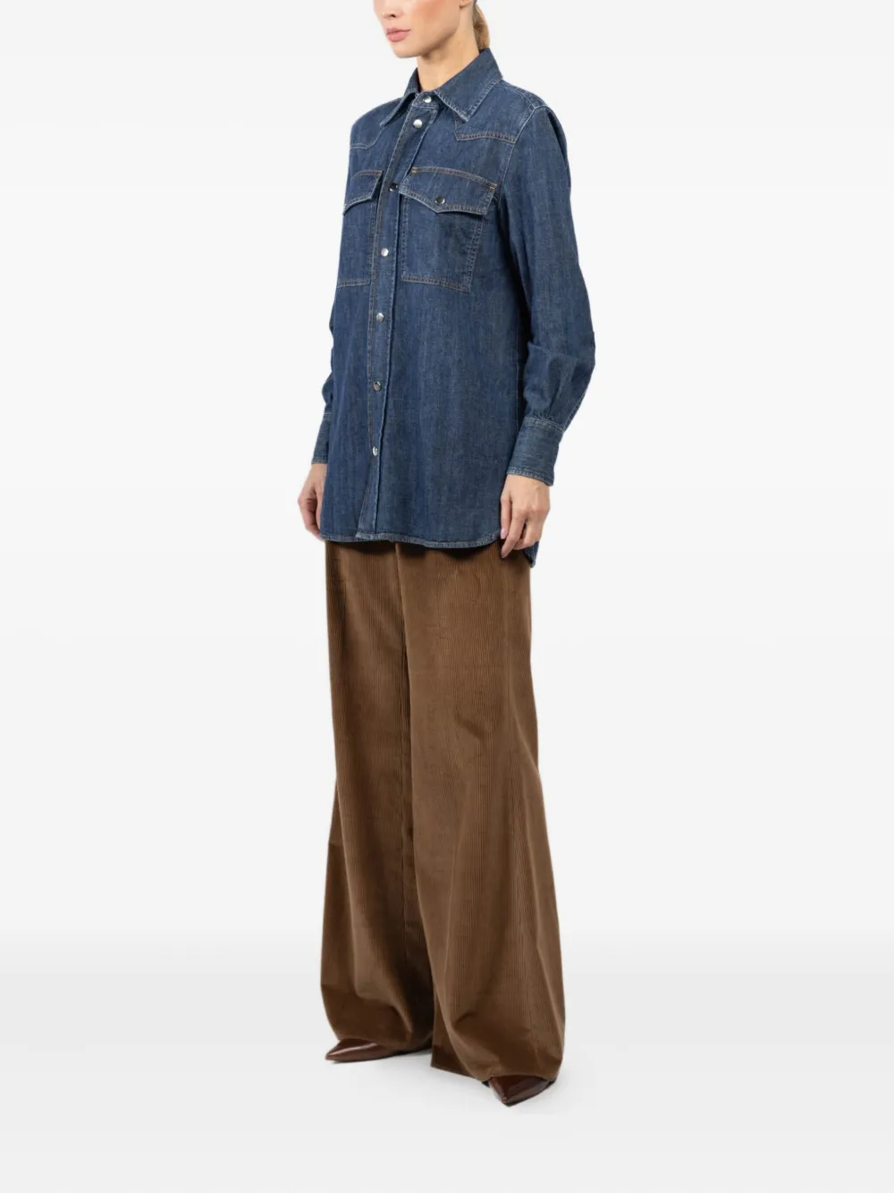 Темно-синий цвет, воротник на пуговицах, нагрудные карманы, застежка на пуговицы, длинные рукава, изогнутый подол