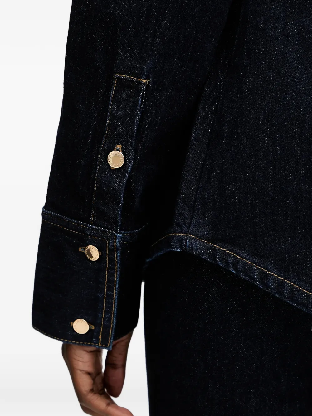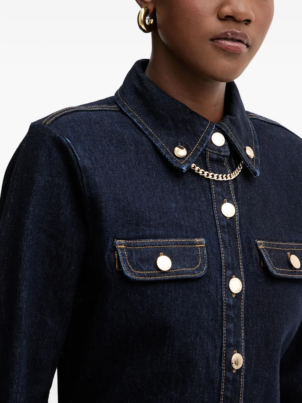 Темно-синий цвет, фурнитура золотистого оттенка, цепочный элемент, накладные карманы с клапанами на пуговицах, застежка на пуговицы, длинные рукава