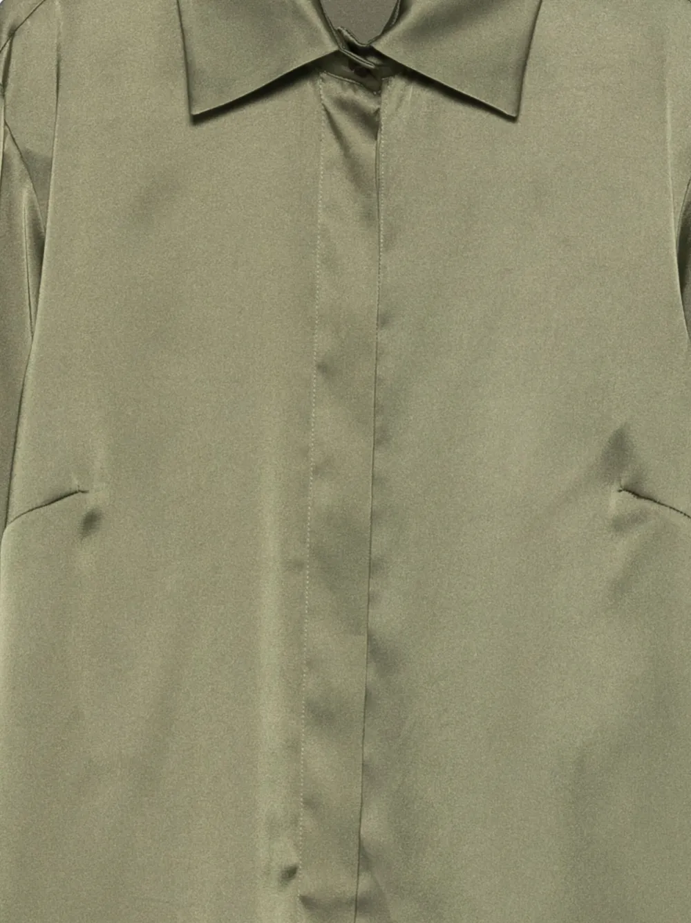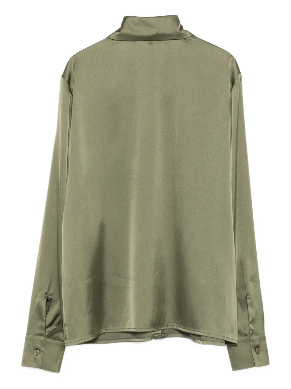 Оливково-зеленый цвет, застежка на пуговицы спереди, длинные рукава, манжеты на пуговицах, нагрудные карманы, классический воротник