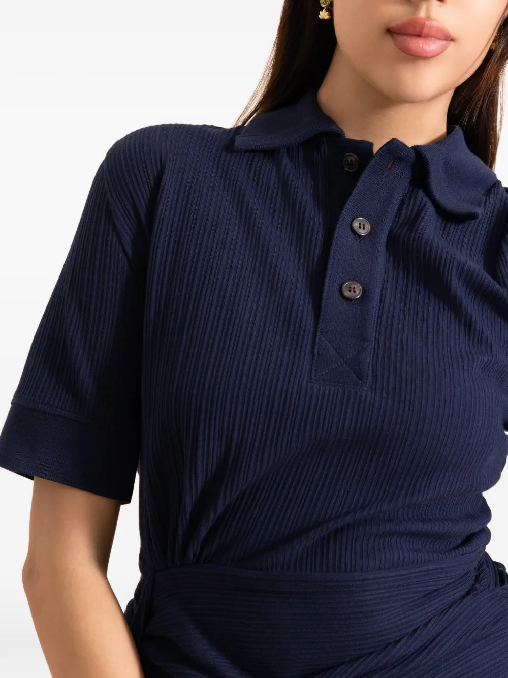 Темно-синяя поло с фактурной рубчатой вязкой, застежкой на пуговицы, воротником-поло и короткими рукавами