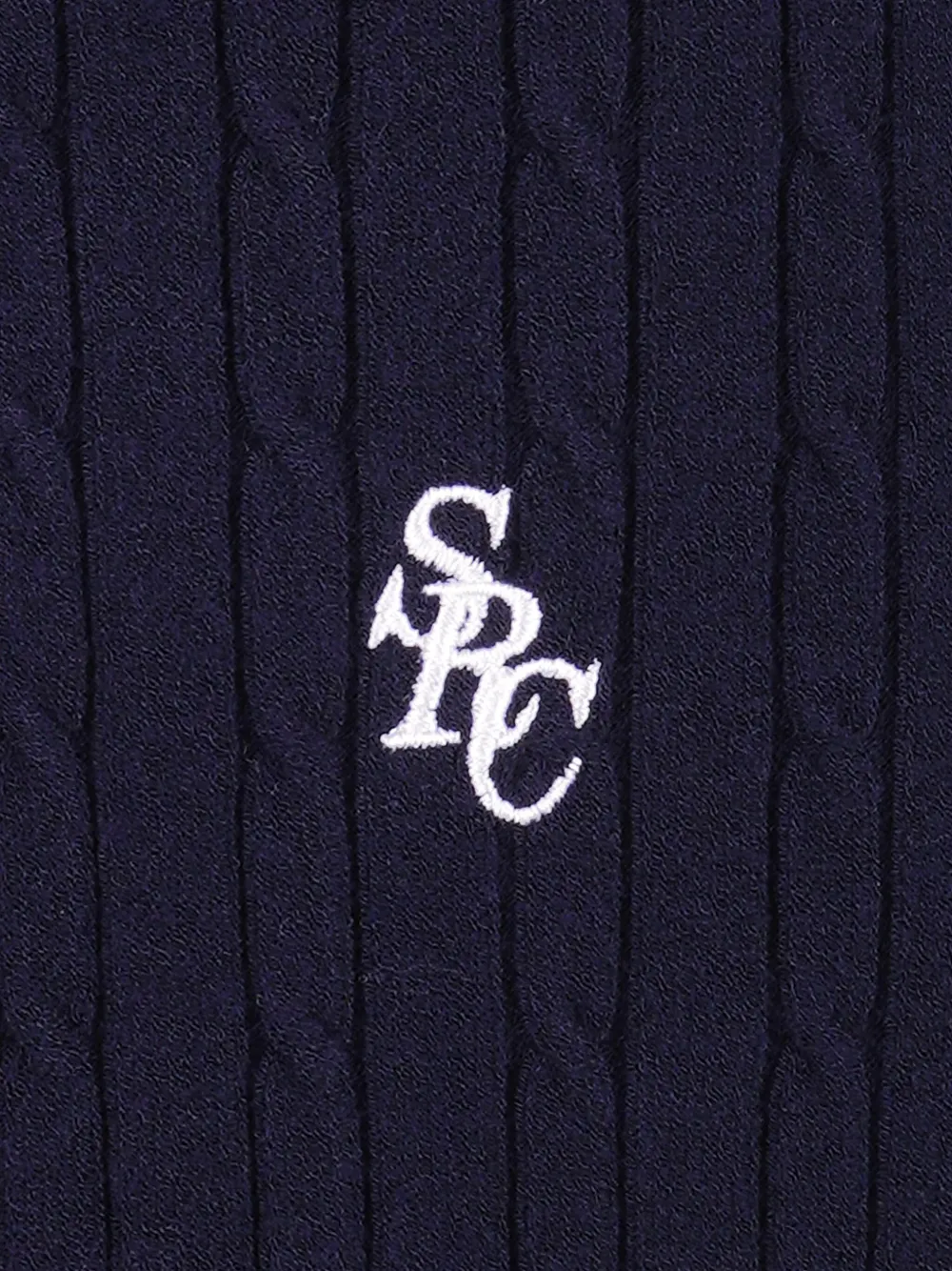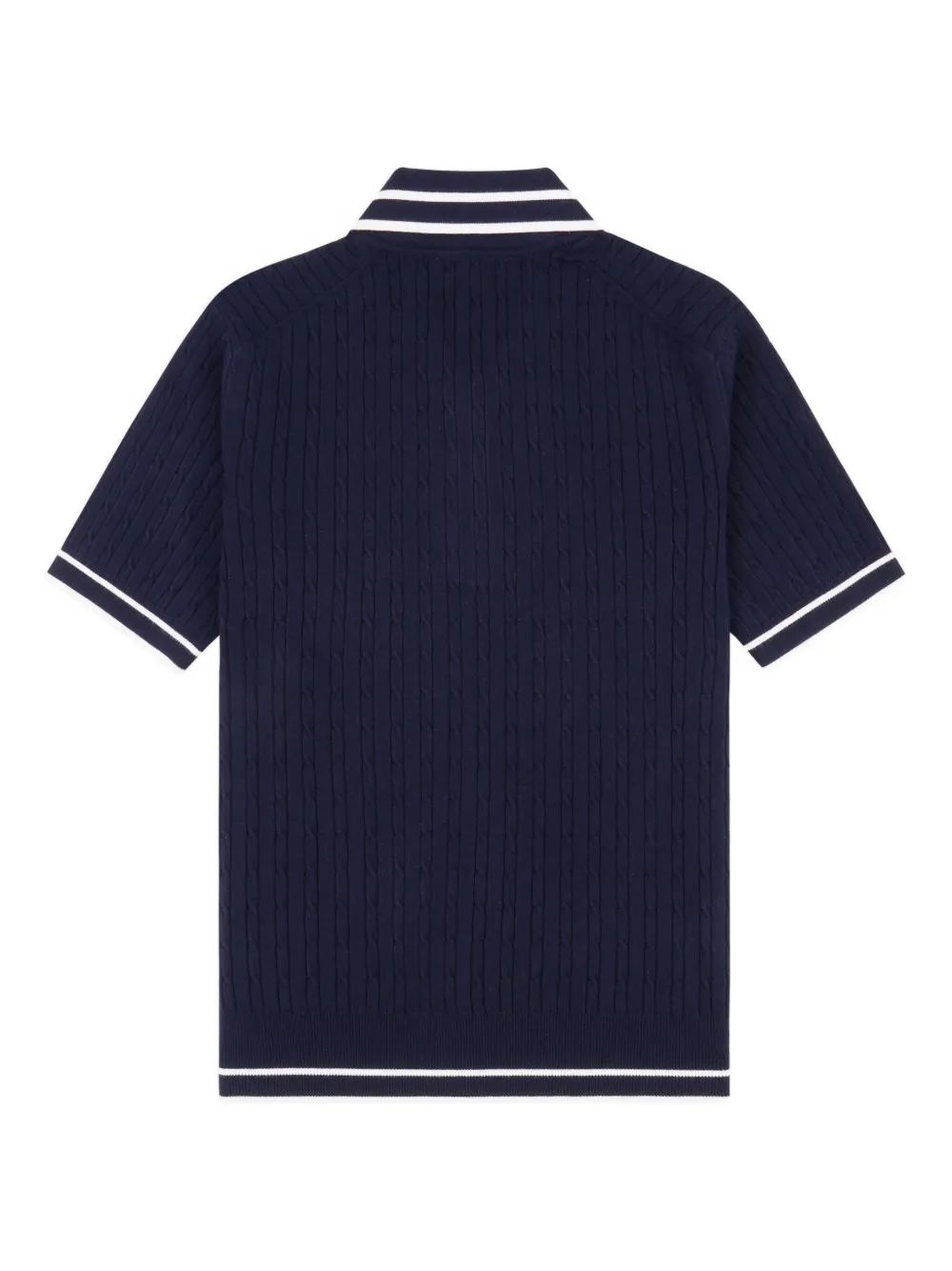 Темно-синяя футболка с короткими рукавами, вязаная косичкой, с белой отделкой, застежкой на пуговицы и вышитым логотипом