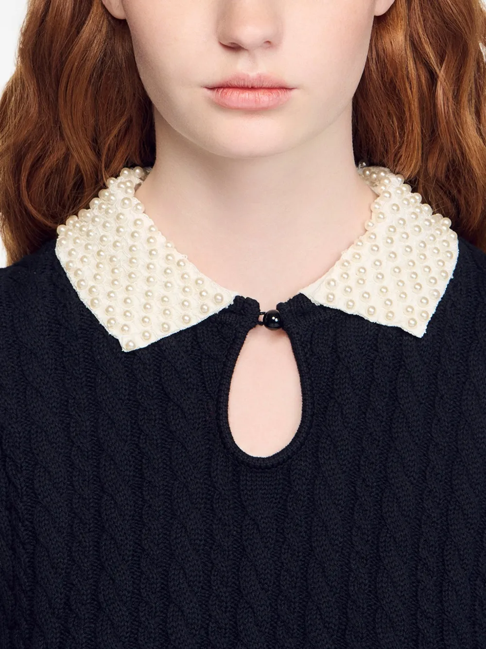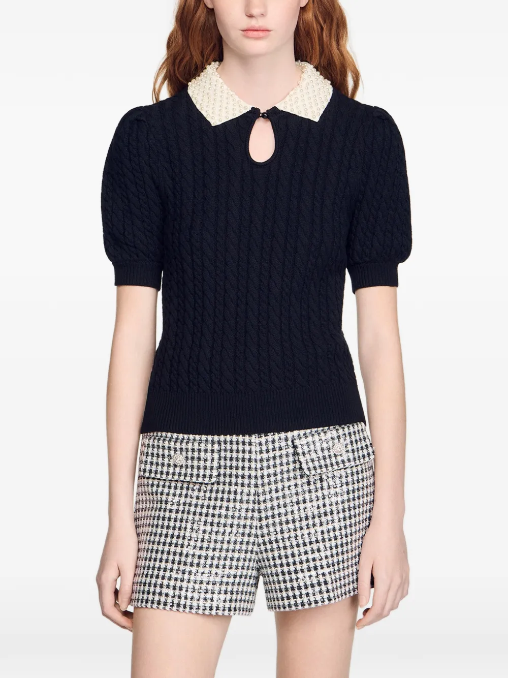 Черная футболка с контрастным воротником, короткими рукавами и вырезом-капелькой