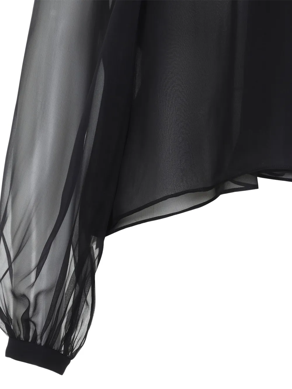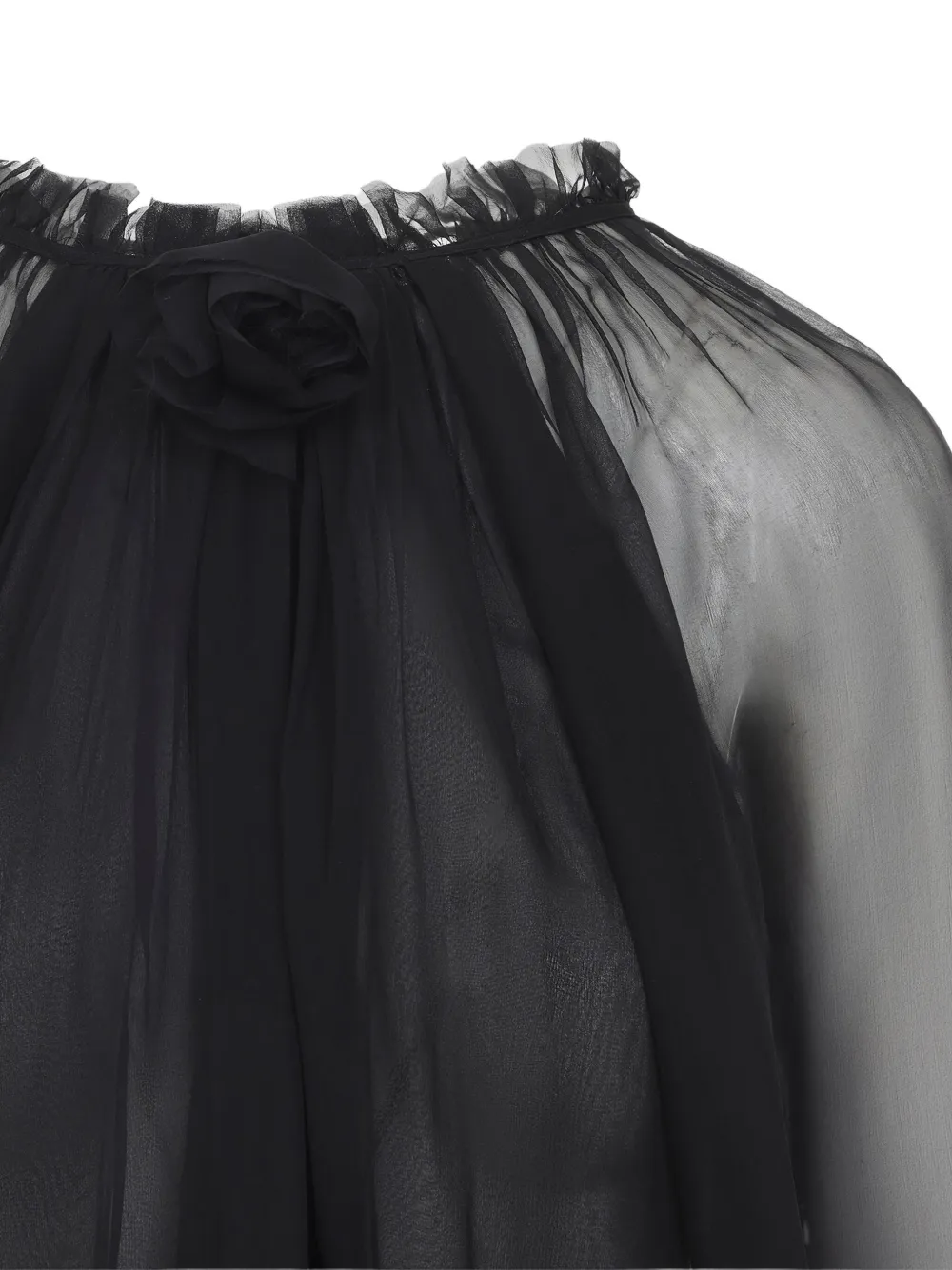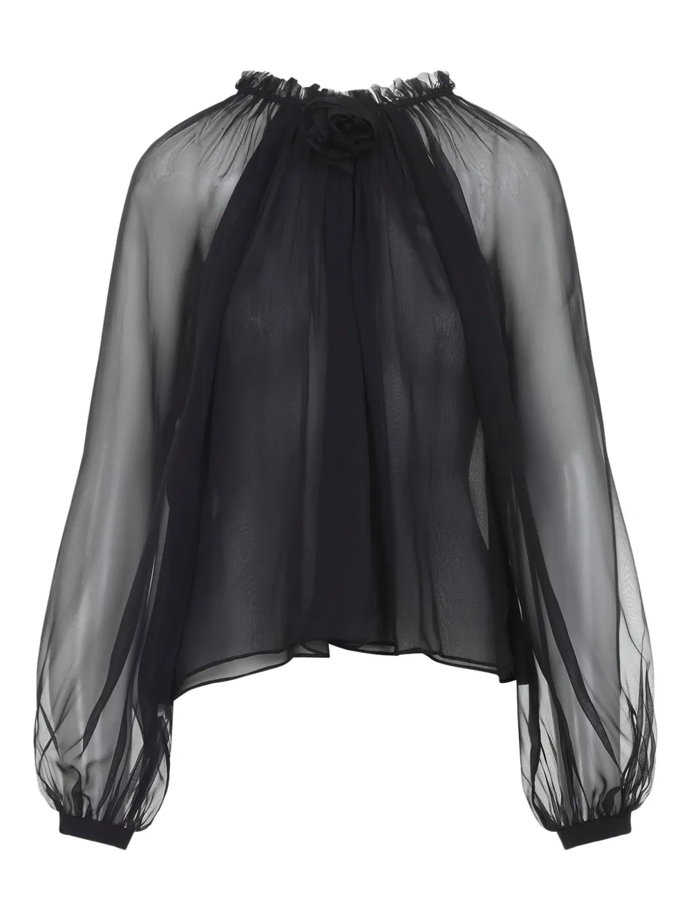 Черный шелк оборчатый вырез рукава-фонарики высокий воротник