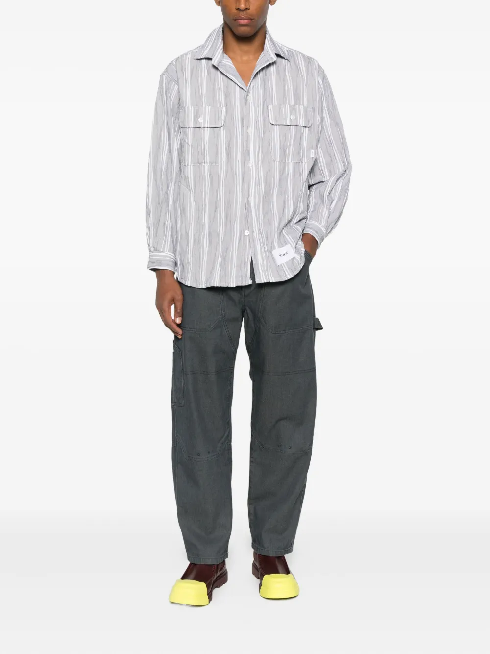 Темно-серый цвет, множество карманов, усиленные накладки на коленях, пуговичная застежка, прямой крой, утилитарный стиль