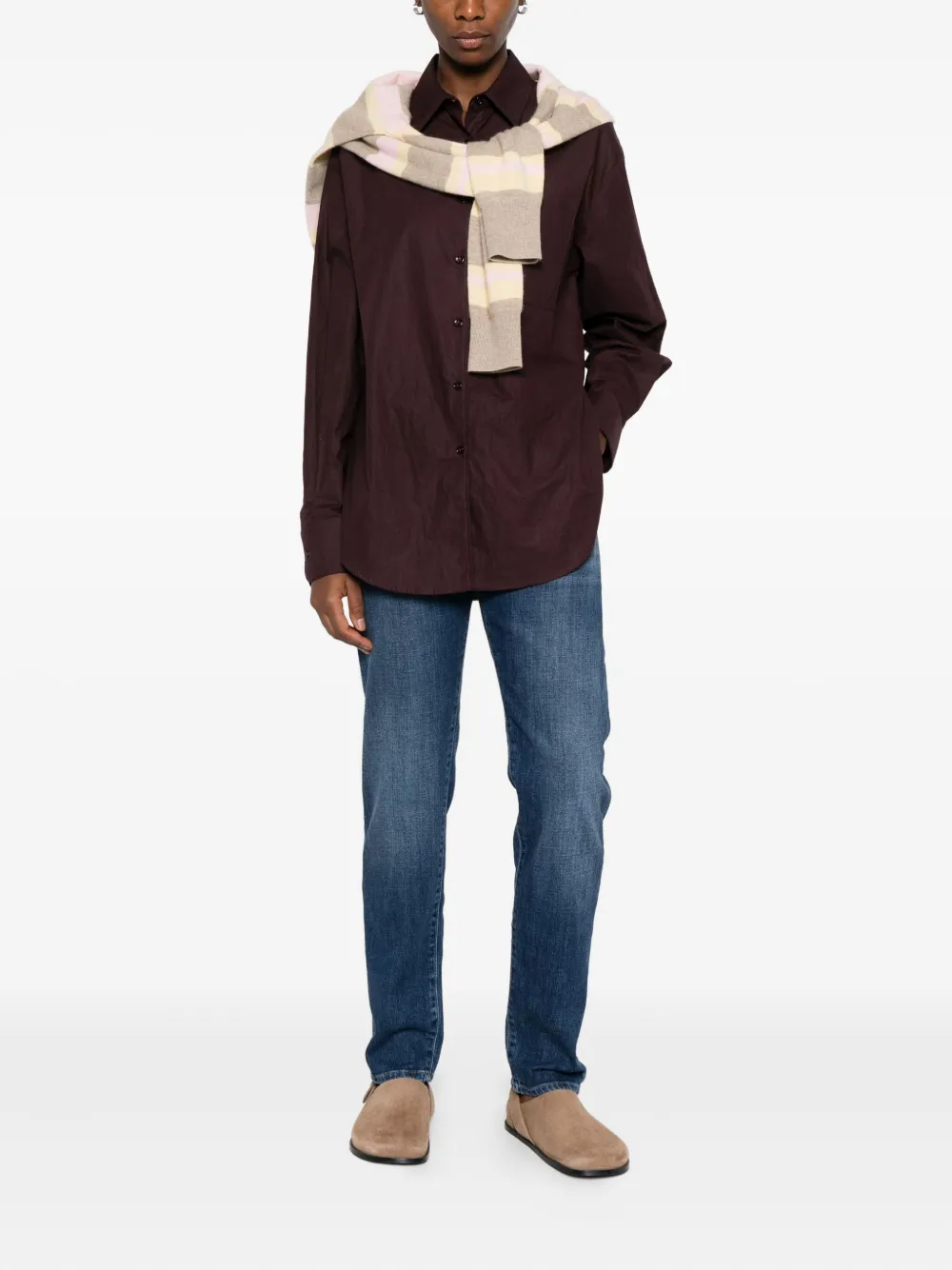 Темно-синие джинсы из переработанного хлопка, пять карманов, застежка на пуговицах, фурнитура золотистого оттенка, прямой крой