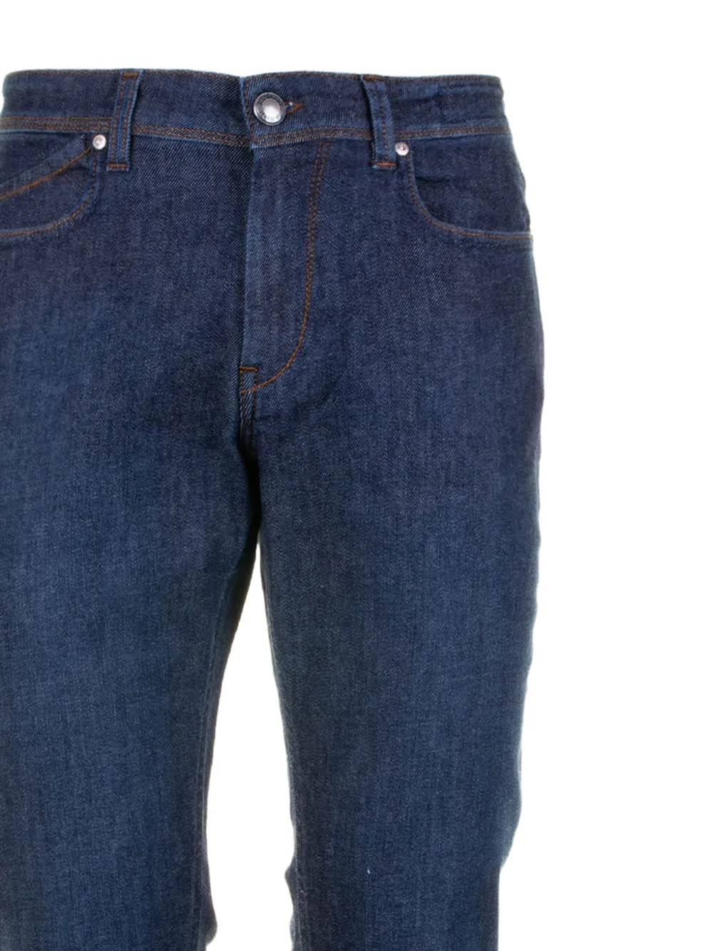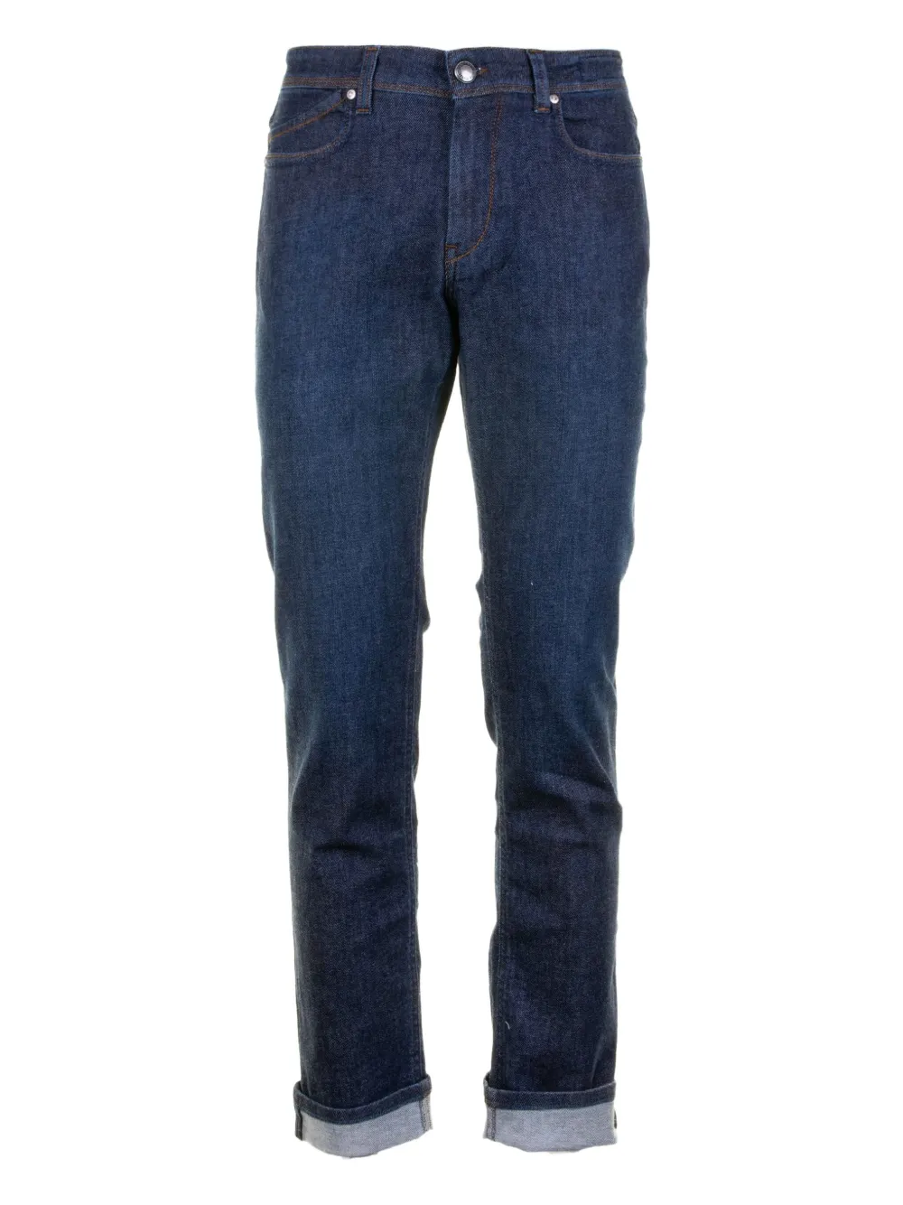 Синие подвернутые края, пять карманов, застежка на пуговицах, шлевки для ремня