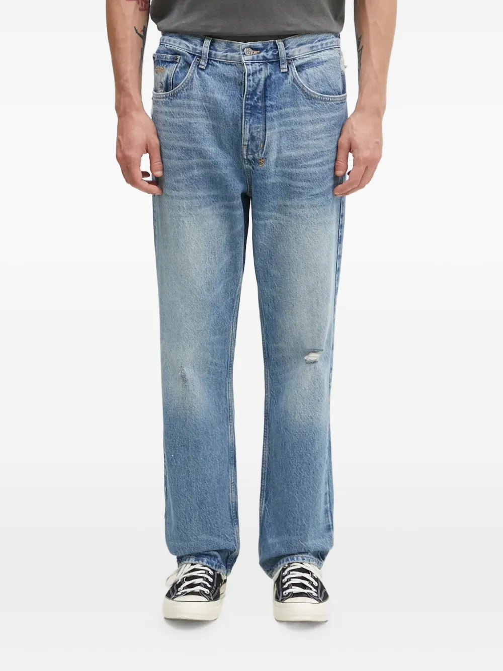 Синий деним с потертостями, пять карманов, шлевки для ремня, застежка на пуговицы
