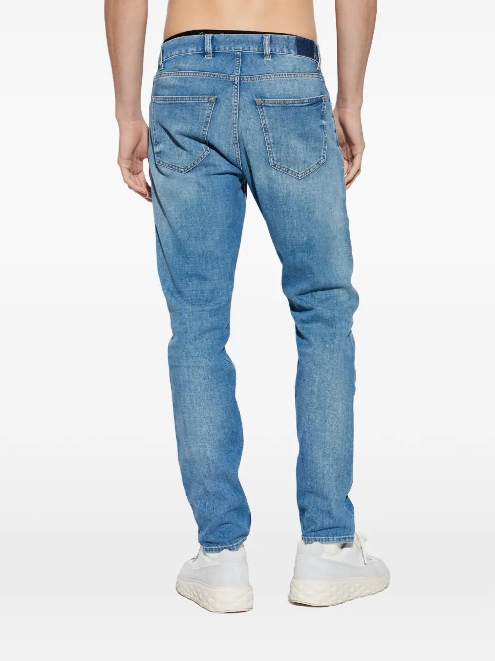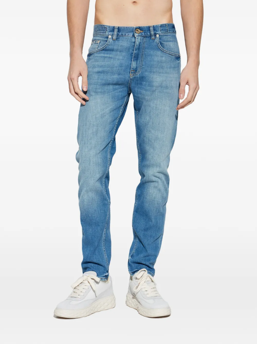 Светло-голубой цвет, дизайн с пятью карманами, шлевки для ремня, тональная отстрочка, застежка на пуговицу, стандартный крой