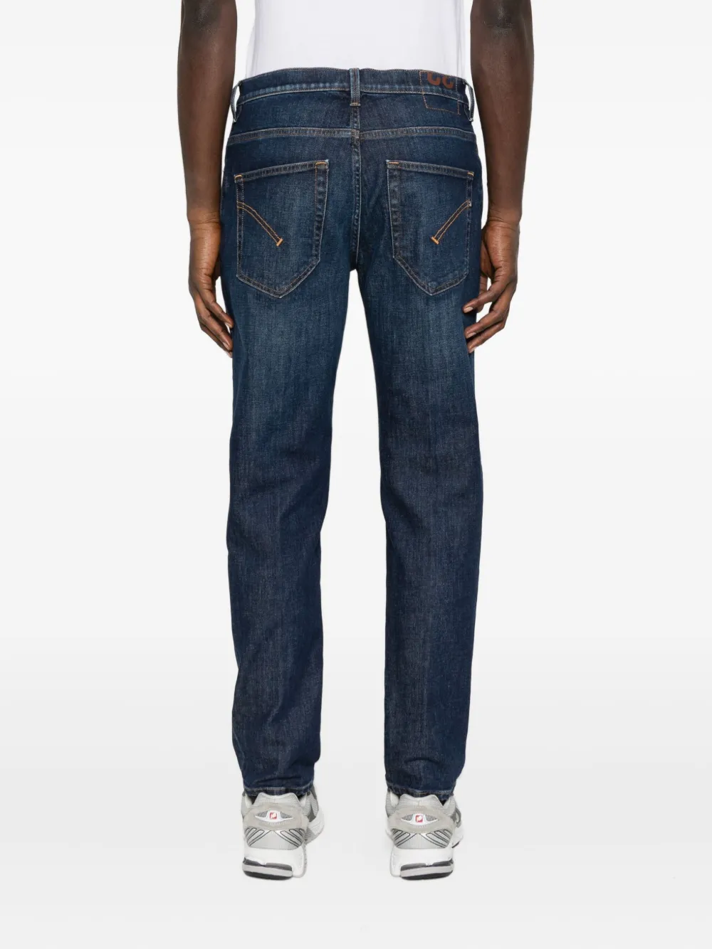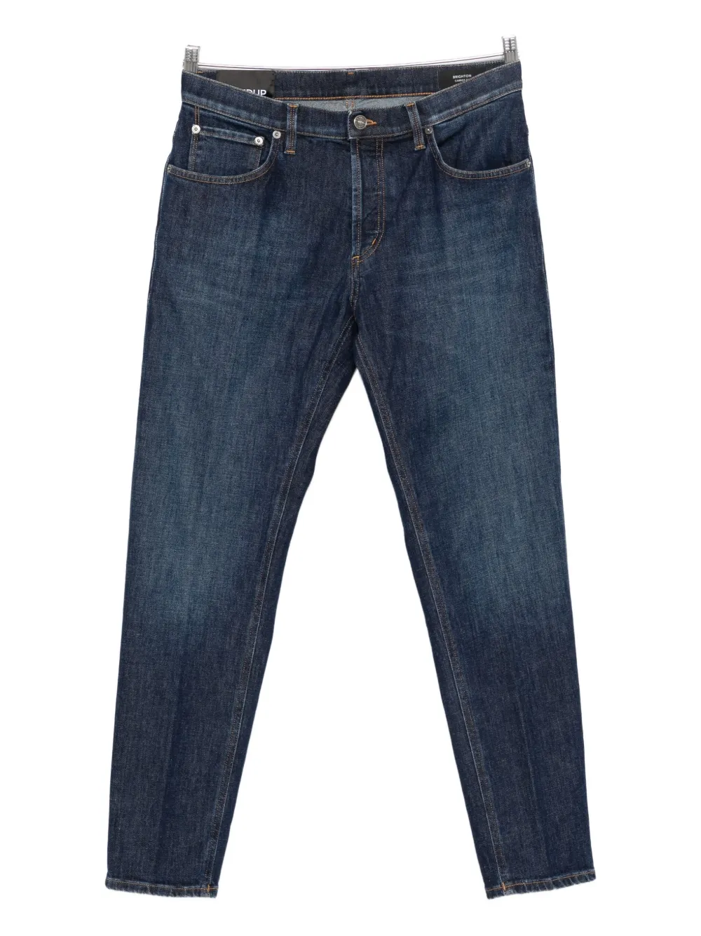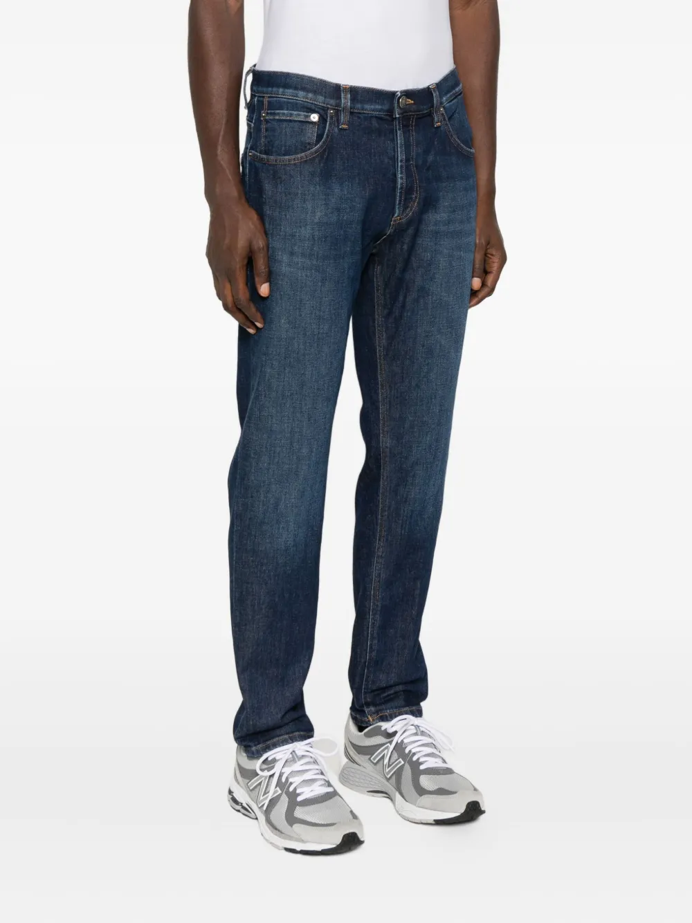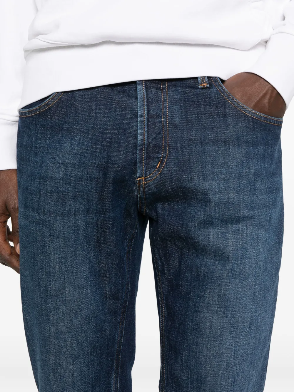 Темно-синие зауженные джинсы с пятью карманами, застежкой на пуговицах и шлевками для ремня