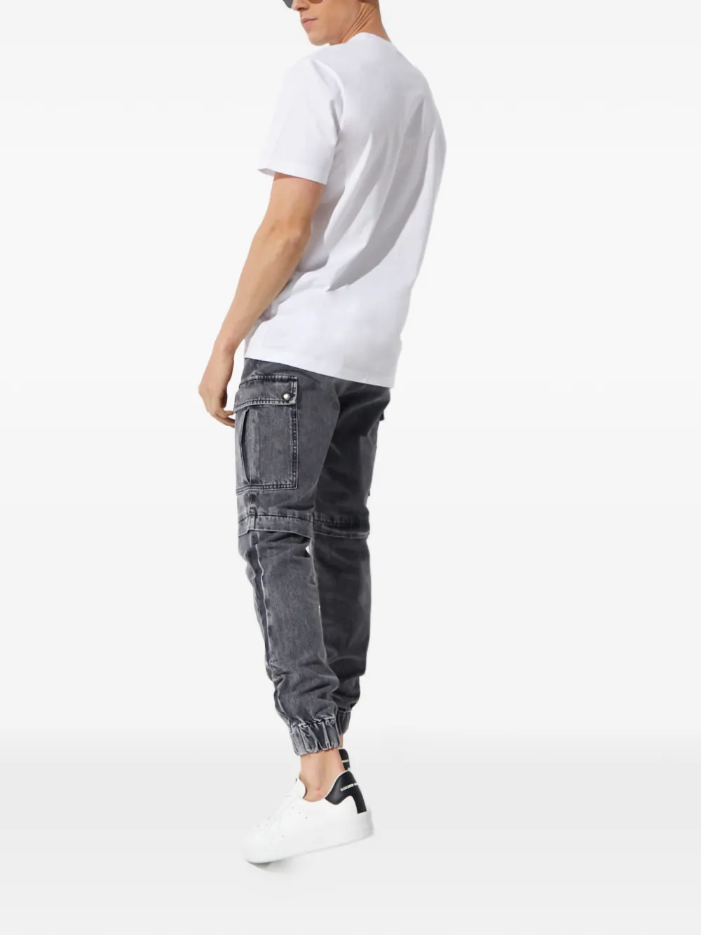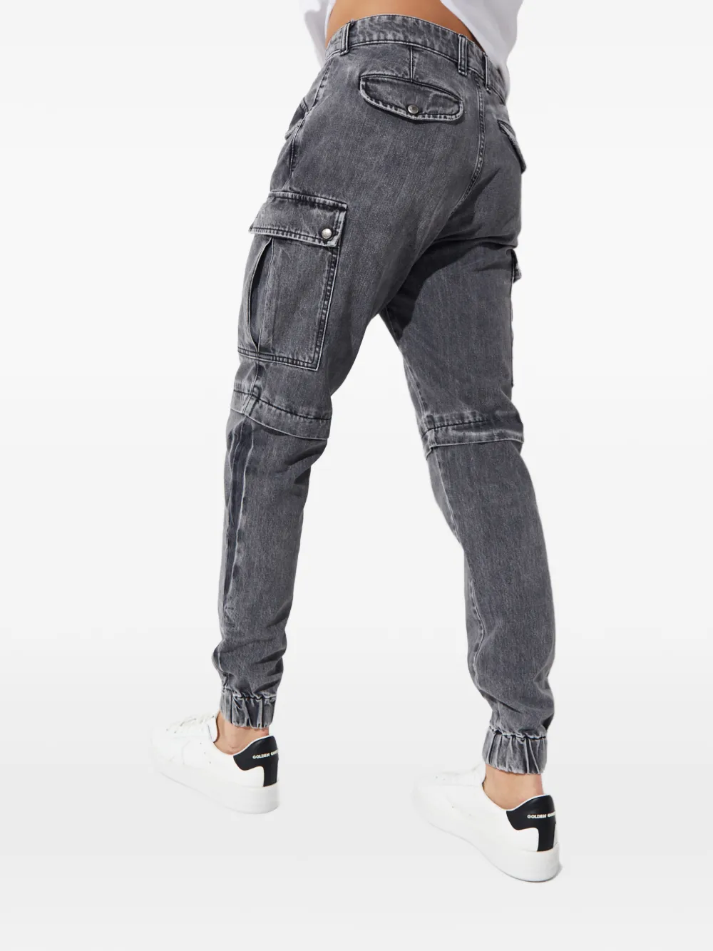 Серый с эффектом выцветания, застежка на молнию и пуговицу, накладные карманы с клапанами, манжеты на щиколотках
