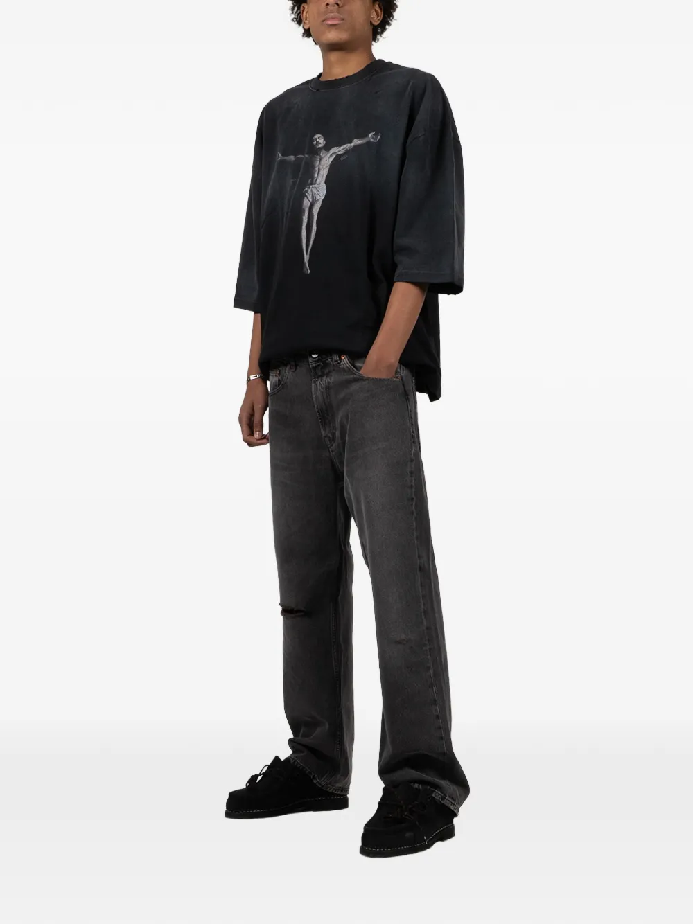 Черные джинсы с потертостями, застежкой на пуговицах, пятью карманами, шлевками для ремня и эффектом состаривания
