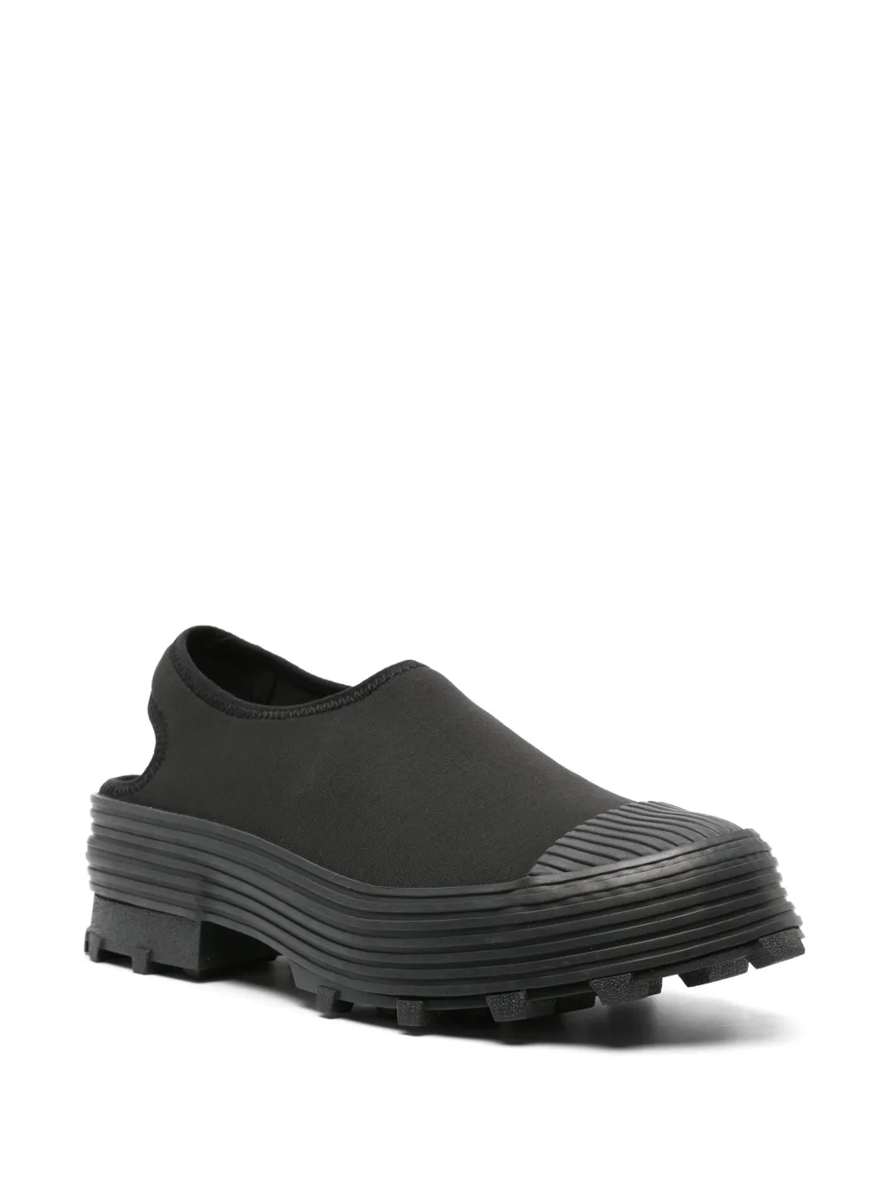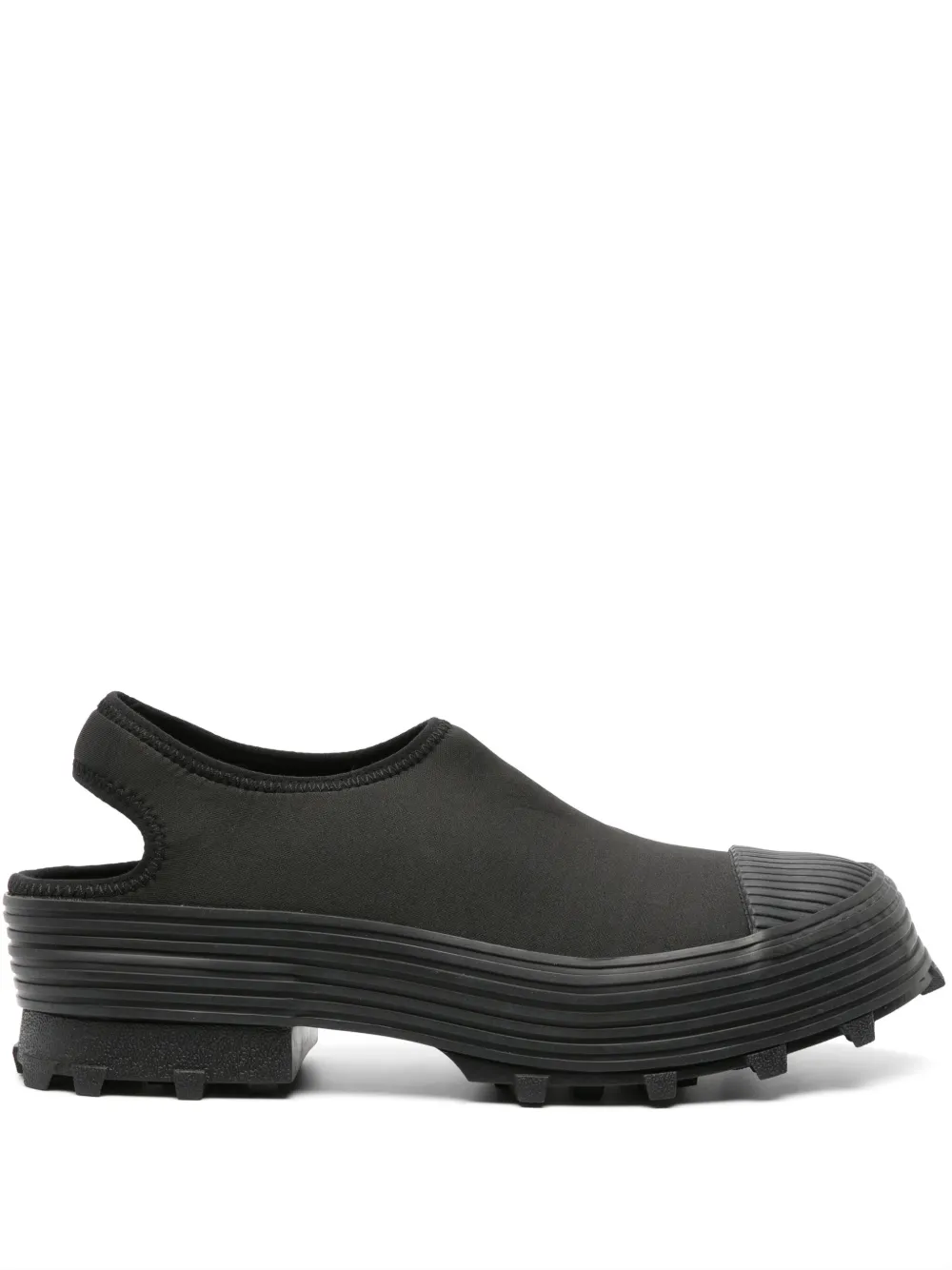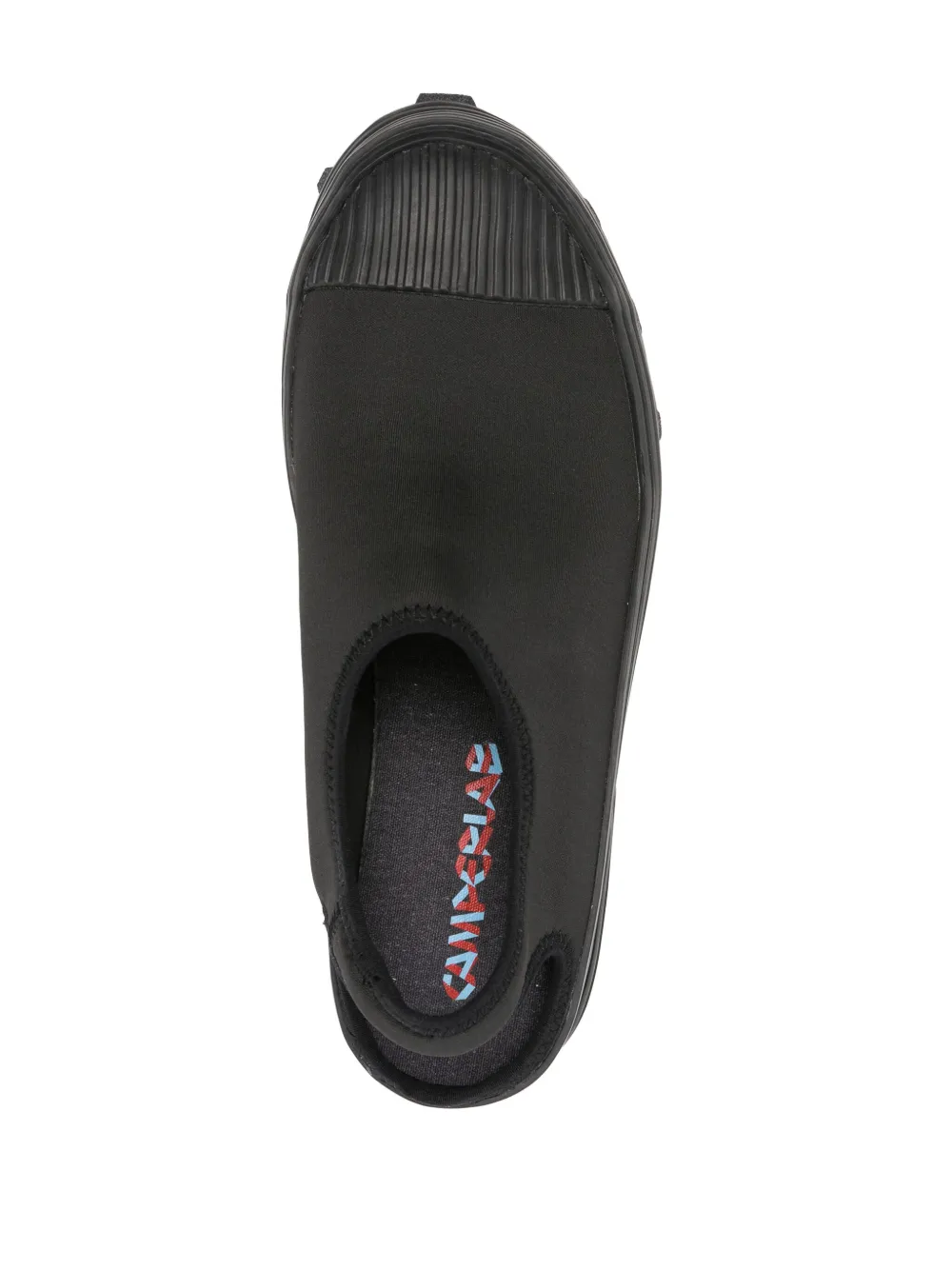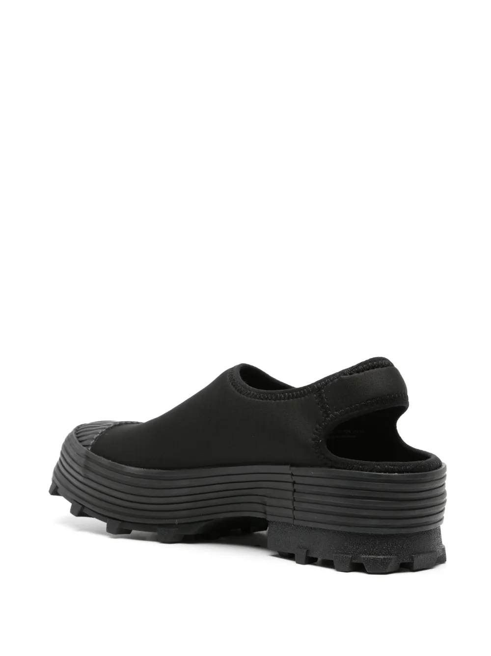 • Черный, смесовый переработанный полиэстер, переработанный хлопок, ткань джерси «скуба», детали в рубчик, вырезные детали, модель без застежки, закругленный носок и стелька с логотипом.